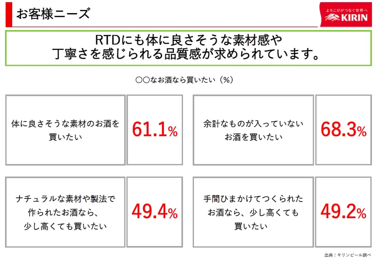 キリンは、もともと約10年前から伝統的な発酵食である麹(こうじ)に着目しており、その可能性を模索していました。また、冒頭で触れたようにRTDのなかで最も活況なフレーバーがレモンですが、消費者の期待のなかに「人工感の低減」「果汁のうまみアップ」「食事との相性の改善」があることをキャッチ。そこで、麹を活用した自然派RTDの開発を急ぎ、約1年半をかけて「キリン 麹レモンサワー」が完成したのです。