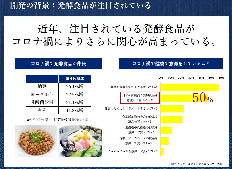 マーケティングリサーチ企業のインテージによると、コロナ禍によって納豆やヨーグルトをはじめとする発酵食品が伸長。また、「日本の伝統的な発酵食品を意識して食べるようになったという人が増えている」というデータも。