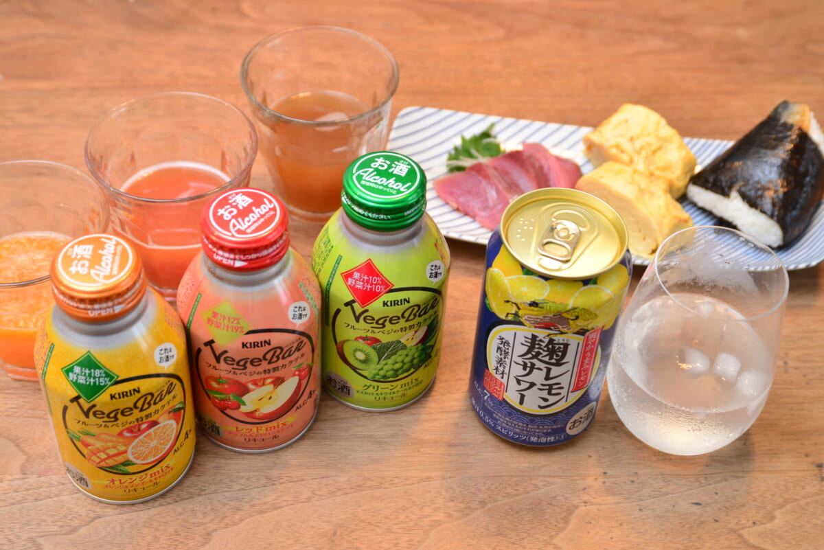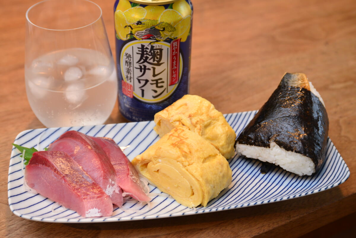 なお、麹自体が伝統的な日本食とよく合うため、「キリン 麹レモンサワー」は和食と一緒に味わうのがオススメとのこと。そこで、刺身、だし巻き卵、魚介を具にしたおにぎりと合わせてみました。