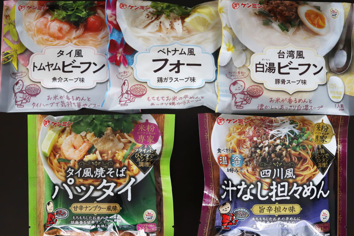 それが国内ビーフンシェアNo1のケンミン食品が販売している本格アジア袋めん「米粉専家」シリーズ。ベトナム風フォー、台湾風白湯ビーフン、タイ風トムヤムビーフン、さらにタイ風焼そばパッタイや四川風汁なし担々めんといったアジアで食べたあの味わいが即席袋麺で食べられるんです。