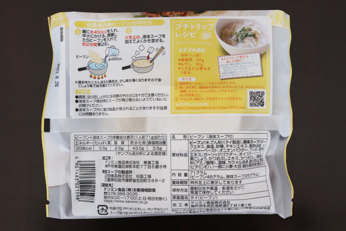 作り方は台湾風ビーフンと全く同じ。違いは言わずもがなのスープ。液体スープの封をあけたときの香りがまさにタイ!「気持ち華やぐスープ」というキャッチコピーは嘘じゃありません!