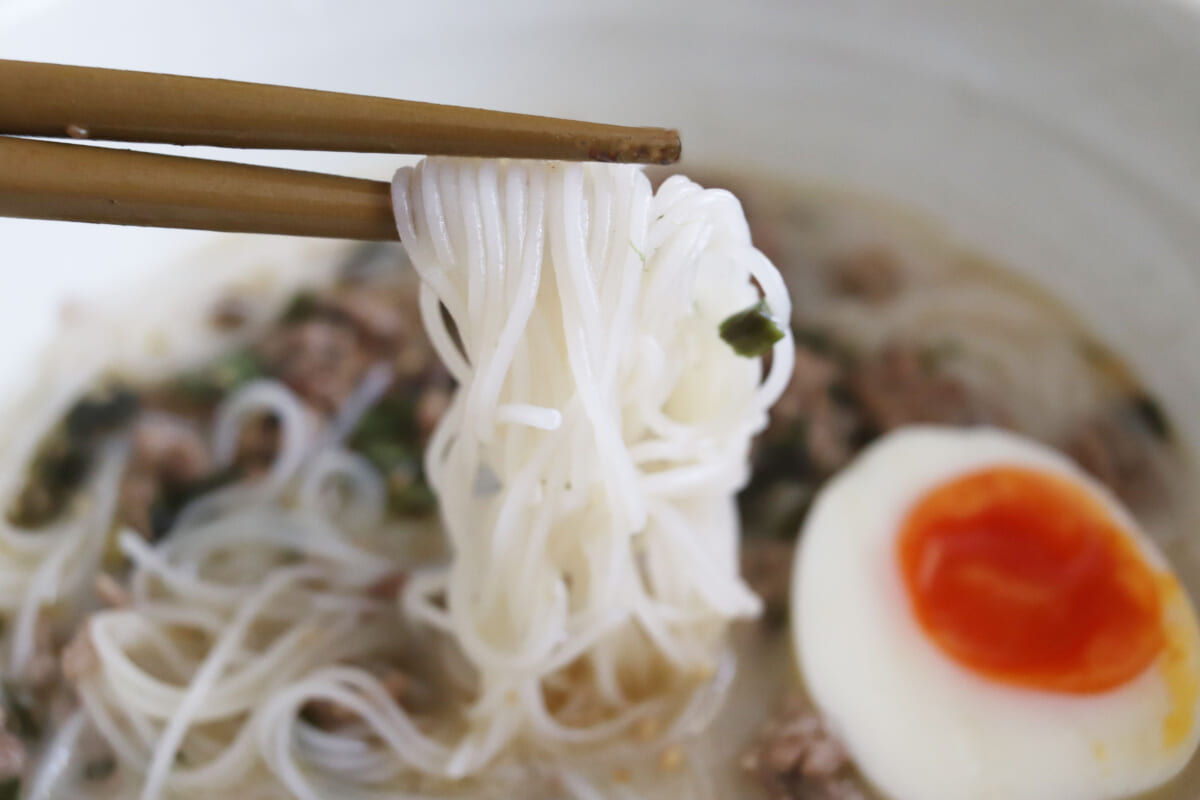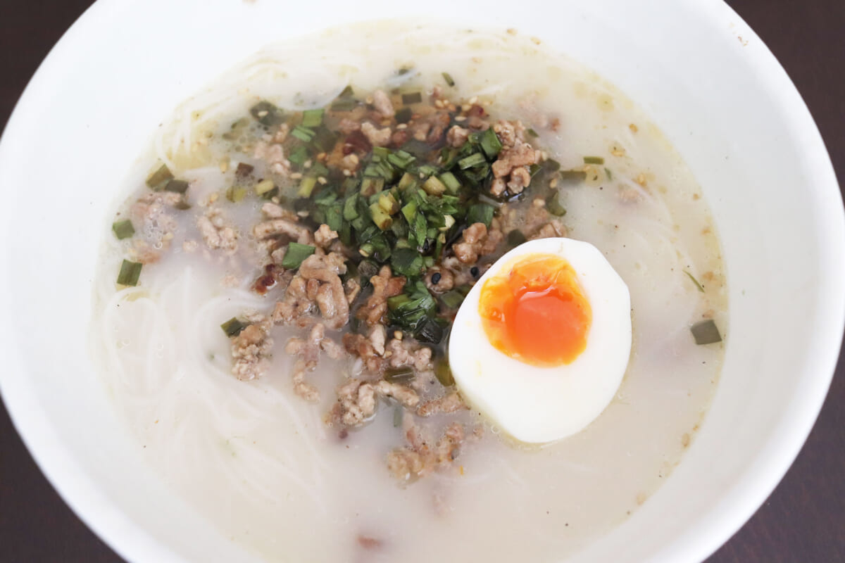 台湾の汁ビーフンで多いのは、あっさり鶏だしスープですが、今回は豚骨スープ味ということでこってりとしたコクのある、ほんのり甘い味わい。なので、もうちょっとアジアン気分を高めたいというのであれば、ラー油や塩コショウでの味変がおすすめ。生のニラを刻んで、ごま油と醤油、みりんに漬け込んで、ひき肉の上にトッピングするとかなりアジアンな味わいになります!
