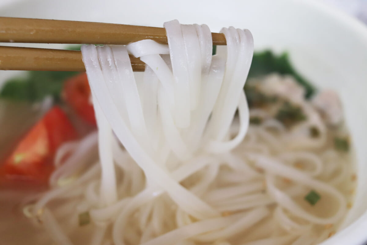 ほどよいもっちり食感で歯ごたえもばっちりなお米の平めんは、ベトナムで食べたフォーそのもの! インスタントとは思えない再現力に驚きました。レシピには4分間煮込むと書いてありますが、食感を楽しみたいなら3分半くらいがおすすめ。煮込みすぎると、食べているときに切れやすくなって食べにくいので、4分半以上は煮込まないように!
