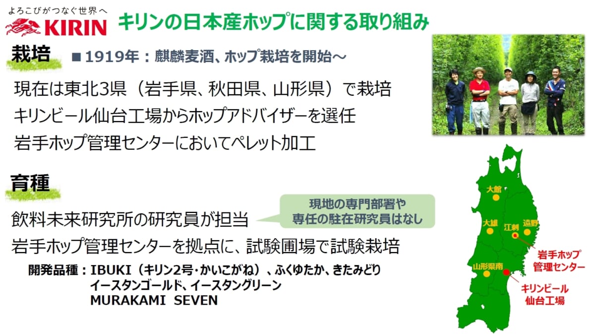自己紹介のあとはいよいよホップの話。キリンとサッポロ、ともに日本産ホップは100年以上前から栽培しているとのことで、さすがは老舗です。キリンは東北を拠点に育種、栽培。技術開発や分析は杉村さんが所属する横浜の飲料未来研究所が主体で行い、商品開発は同場所にある商品開発研究所と中野の本社が連携して様々なビールを生み出しています。