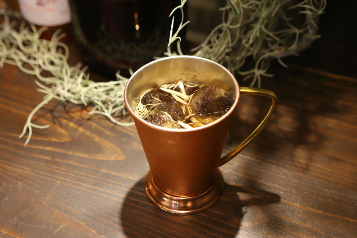 篠﨑さんの知人のお茶屋さんが作ったほうじ茶のシロップを採用したカクテル(裏メニュー)。ウォッカとイタリアのリキュール・ガリアーノをシェイクしたもので、口の中に広がる複雑な甘味により、つい何度も口をつけたくなる病みつき感がありました。