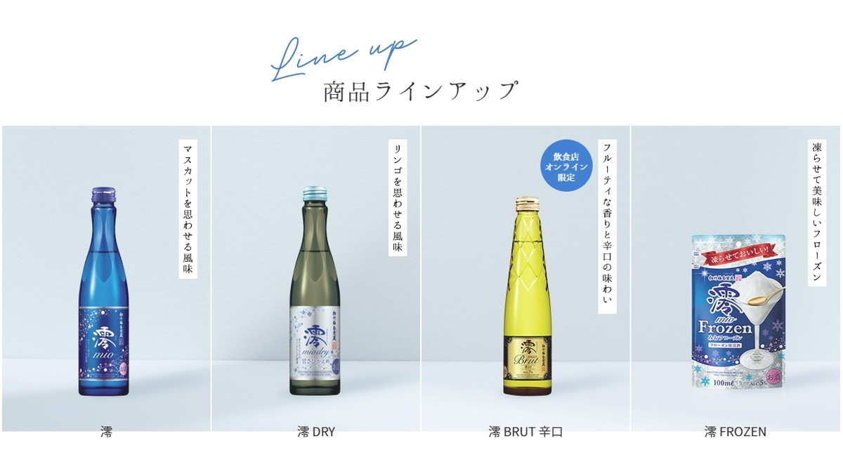 こうして新たな日本酒の開発がスタートしてから約6年後、2011年にデビューしたのが「澪」。その名称には、「浅瀬の水の流れ」や「船が通ったあとにできる泡の跡」という意味がある「澪」を採用。浅さを低アルコール、泡の跡を発泡性にたとえており、清酒の新しい流れを作るという思いが込められています。さらに、イタリア語でMIOが「私の」という意味を持つことから、日本酒にあまりなじみがなかった人にも「私のお酒」として楽しんでほしいという願いもあるとのこと。そんな「澪」は、ほんのりした甘さとほのかな酸味、低アルコールとやさしい泡が相まって飲みやすく、若者や女性を中心に、日本酒の入口として人気に火が付きました。