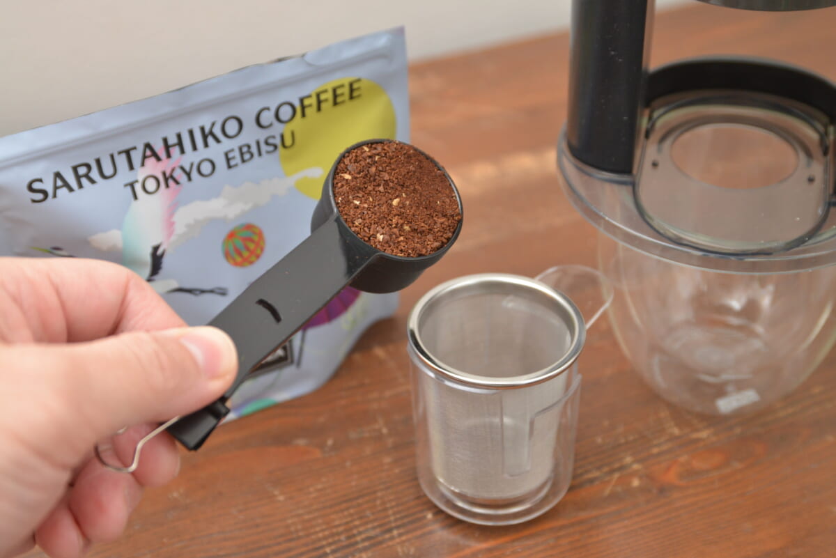 ここからは、いよいよドリップにトライ。計量スプーンで豆を計りステンレスフィルターに入れます。本体にセットしたらスイッチをオン。すぐに「ウィーン」を回り始めるので、上からお湯を流し込んでドリップが完了するのを待ちます。