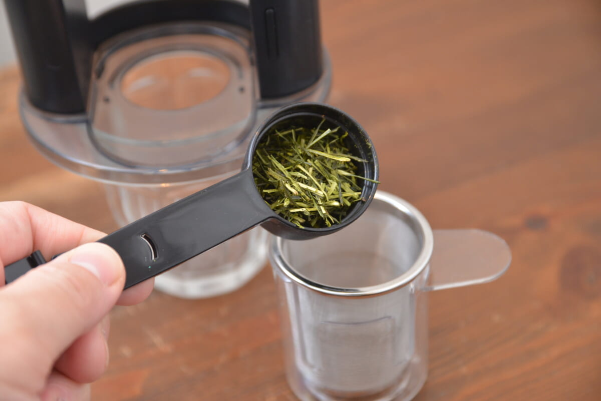 茶葉など、コーヒー豆以外をドリップできる汎用性も本機のメリット。そこで、緑茶を抽出してみることに。使い方は、ステンレスフィルターに茶葉を入れて、コーヒー同様にドリップするだけです。