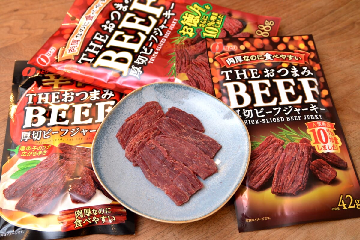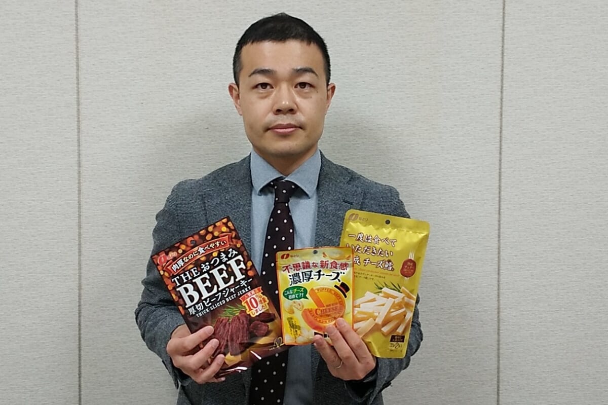 最後は「THEおつまみBEEF」。開発のきっかけとなったのはビーフジャーキーの売上低迷で、その理由を探ると「味は好きだけど食感が硬い」という声があったとか。そこで、食べごたえと食べやすさを両立させる新商品開発に着手し、苦労の末に誕生したと武井さんは言います。