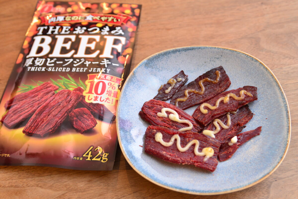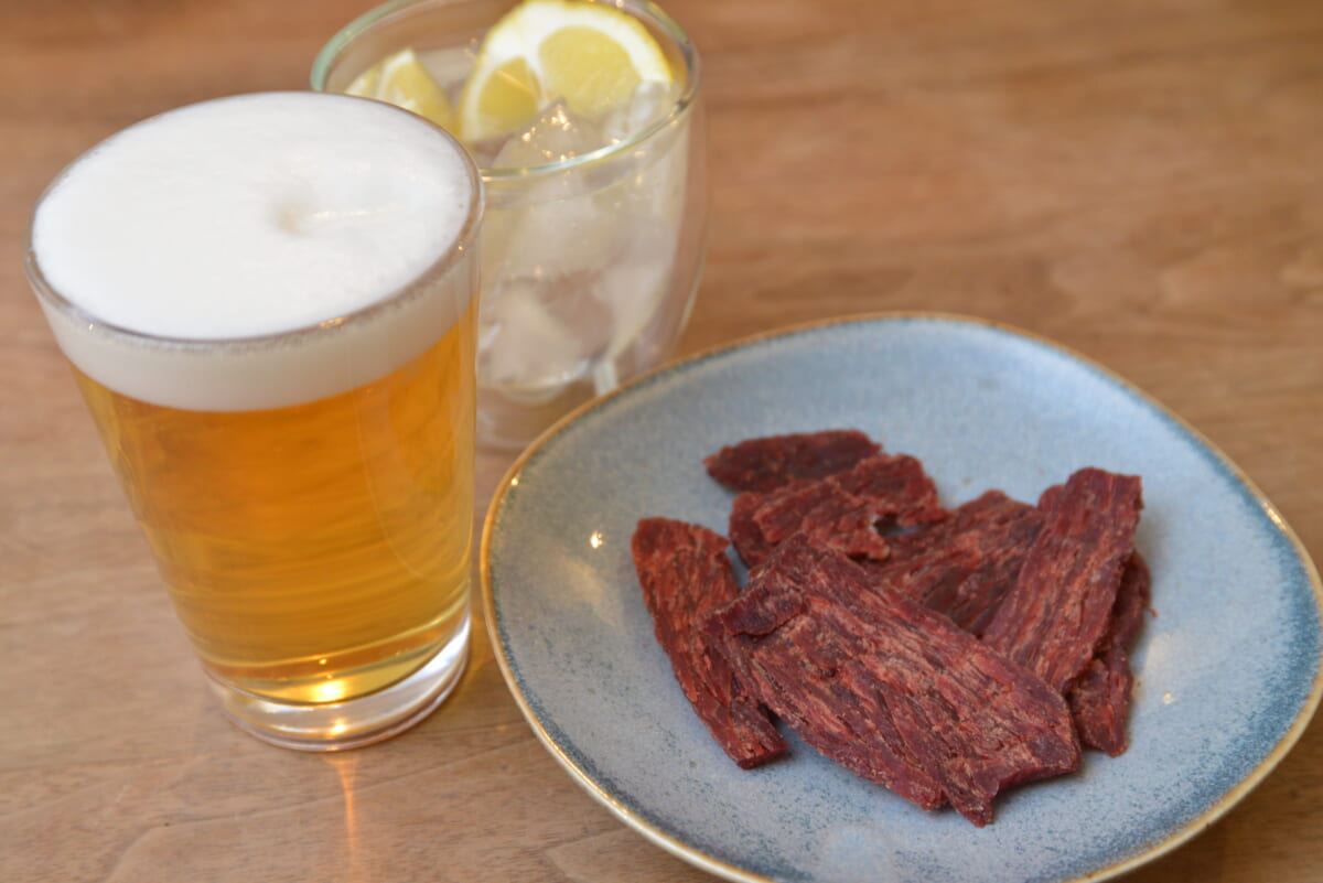「最終的には新たに開発した特許製法を用いることで、商品化にこぎつけました。厚みがありながらほぐれやすいという新食感で発売直後からヒットし、新たなビーフジャーキー市場を切りひらけたのではないかと自負しております。ビールや新ジャンル、またレモンサワーがオススメです。レモンサワーは、甘くないタイプのほうがより肉との相性がいいですよ」(武井さん)
