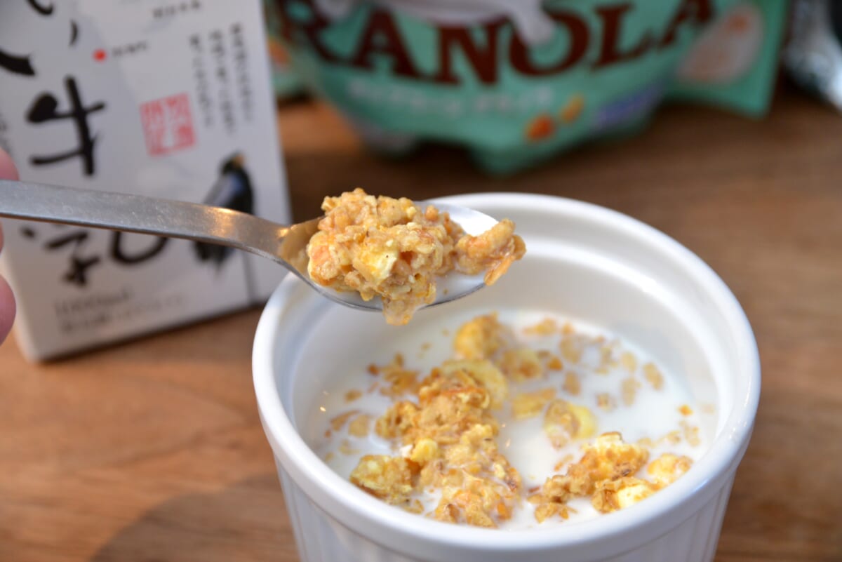 牛乳は「ポップコーン グラノラ」全体の味をマイルドにする方向性で、やはりベストマッチ。甘香ばしいキャラメルフレーバーが牛乳のミルキー感とひとつになり、期待通りの安定感ある味わいです。