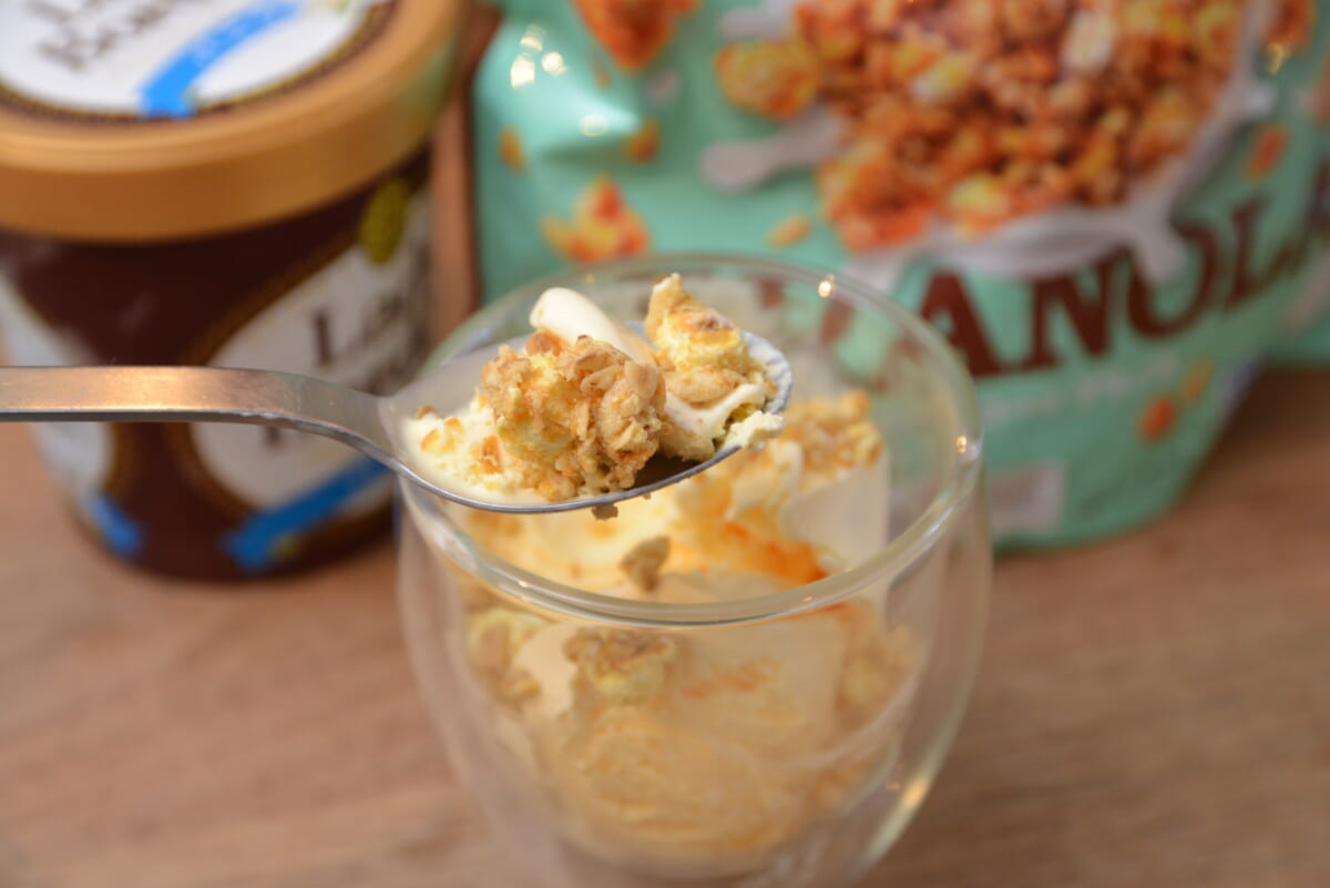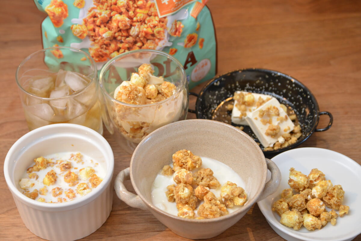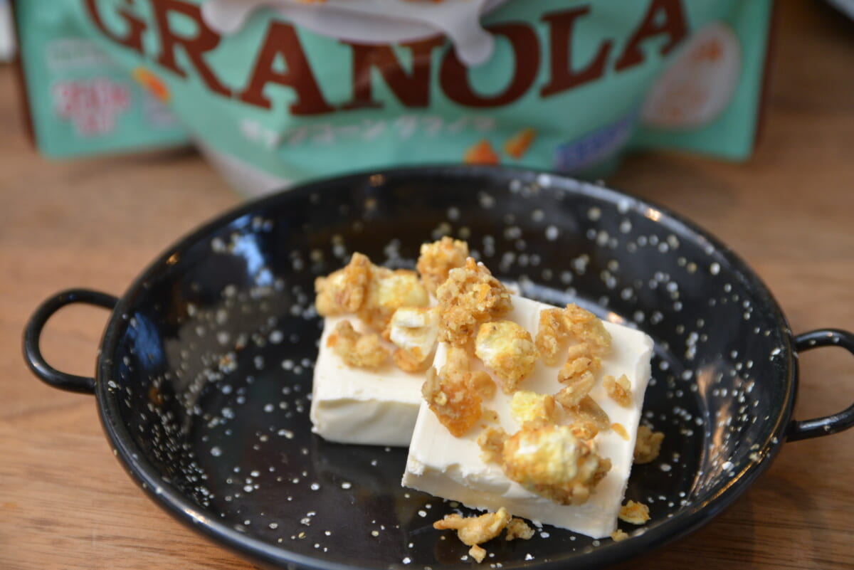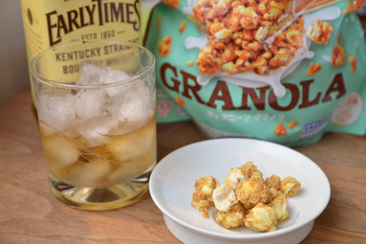 これも間違いない組み合わせです。キャラメルの甘香ばしさと、バニラアイスのクリーミーな甘味が至福の一体感。「ポップコーン グラノラ」は甘さが控えめで塩味もあるので、バニラアイスのストレートな甘さとは余計に合います。このアイスアレンジや、クリームチーズアレンジを、バーボンとのペアリングに用意すると、それだけで贅沢なチルタイムになるでしょう。