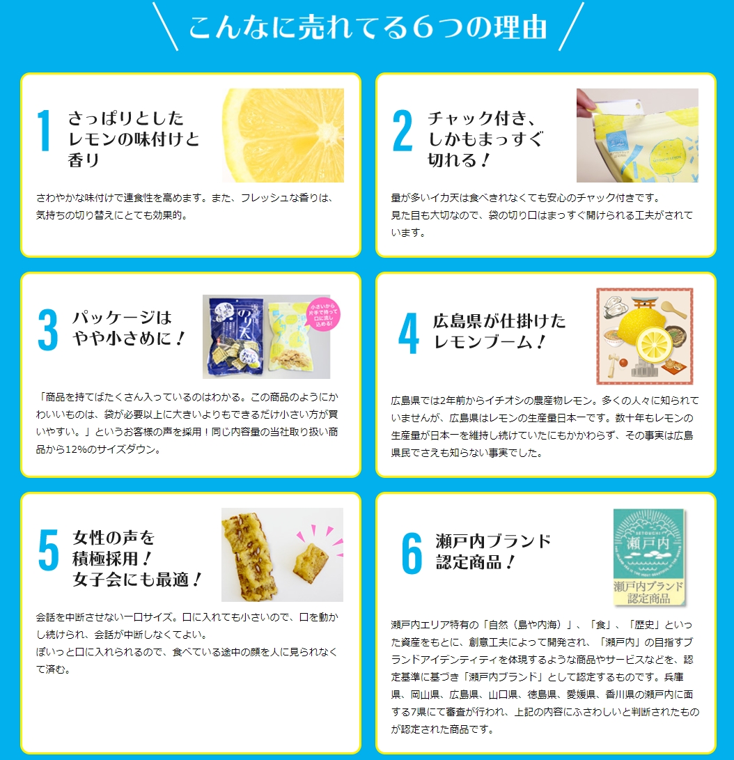 一方の「イカ天瀬戸内れもん味」は、広島県の尾道を拠点に、イカ天やのり天などを製造販売している「まるか食品」が2013年から発売している大ヒット商品。レモンフレーバーによる独自のさっぱりテイストやキュートなデザインで人気に火が付き、2021年には累計2000万食を突破したそうです。