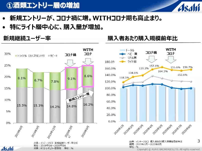 2020年に顕在化したもうひとつの傾向が、「酒類エントリー層」の増加です。これはもともと酒類をリピートしている人たちではなく、新しくエントリーする層。つまり、いままでお酒を買わなかったライトなユーザーたちの購入量が、コロナ禍を機に伸びているのです。