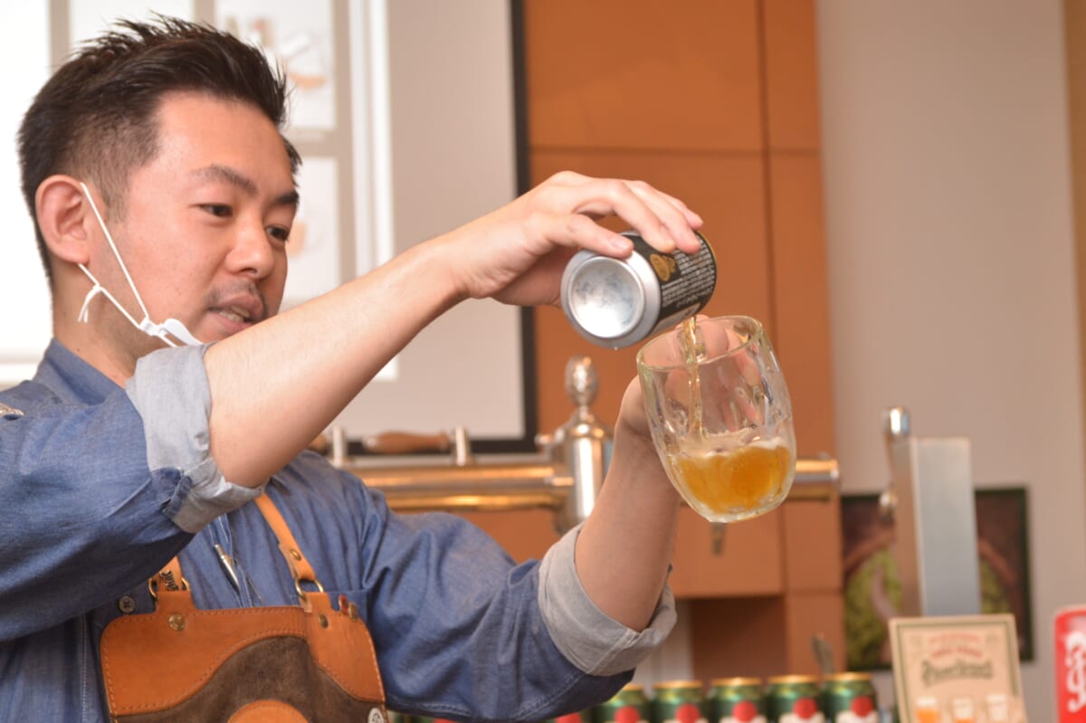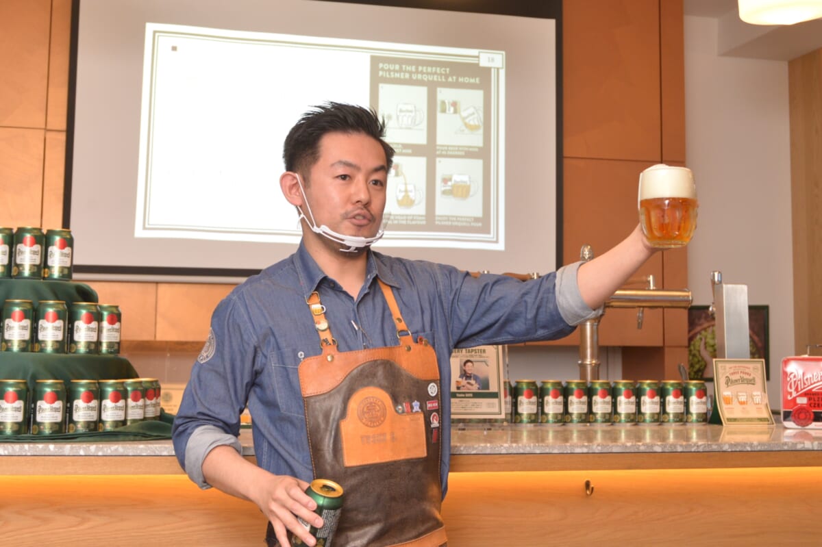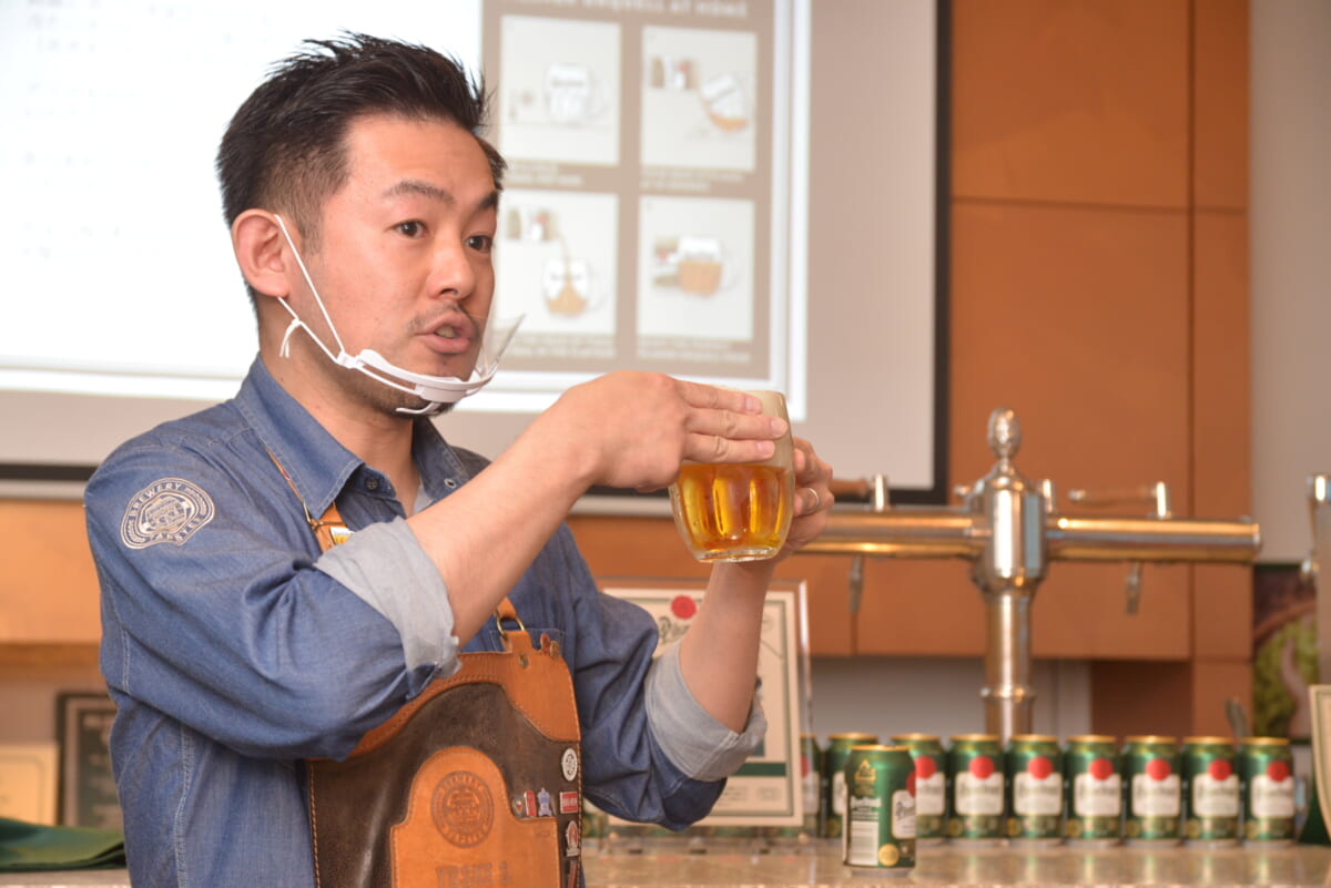 発表会の後半は、おいしい注ぎ方レクチャーとフードペアリング体験。佐藤さんは前述したように、「アサヒスーパードライ」の注ぎ手としても有名ですが、「ピルスナーウルケル」を最高の品質で提供し、自らの言葉でその歴史や品質を語り、ブランドの魅力を発信していく役割「タップスター」に認定された日本初の人物でもあります。