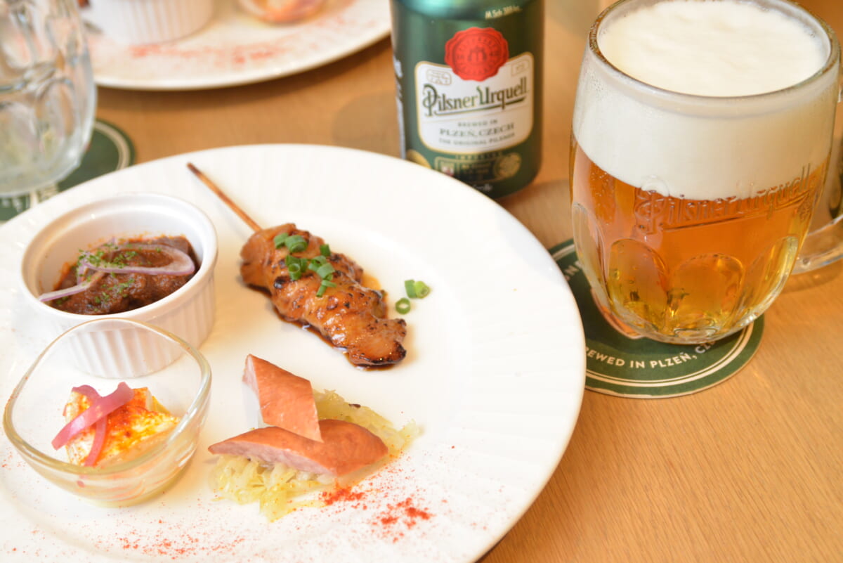 「ピルスナーウルケル」は、日本のピルスナーがそうであるように、どんな料理とも相性抜群。なかでも特に合うというフードを佐藤さんが用意してくれました。チェコの定番料理セットと、タレ味の焼き鳥です。