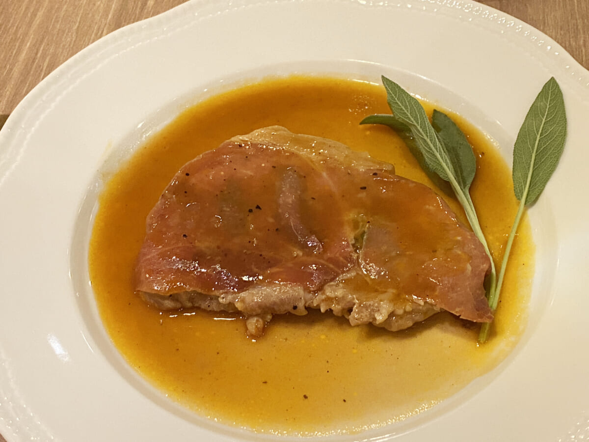 「ポークのサルティンボッカ」は国産豚ロース肉にセージと、生ハムを巻いて焼き上げたローマの伝統的な郷土料理。 豚ロース肉のあっさりとした部分と、濃厚な脂身が絶妙なコントラストを楽しませてくれます。濃厚なマルサラソースをたっぷりつけて食べると口の中が旨味で溢れること間違いなしです。
