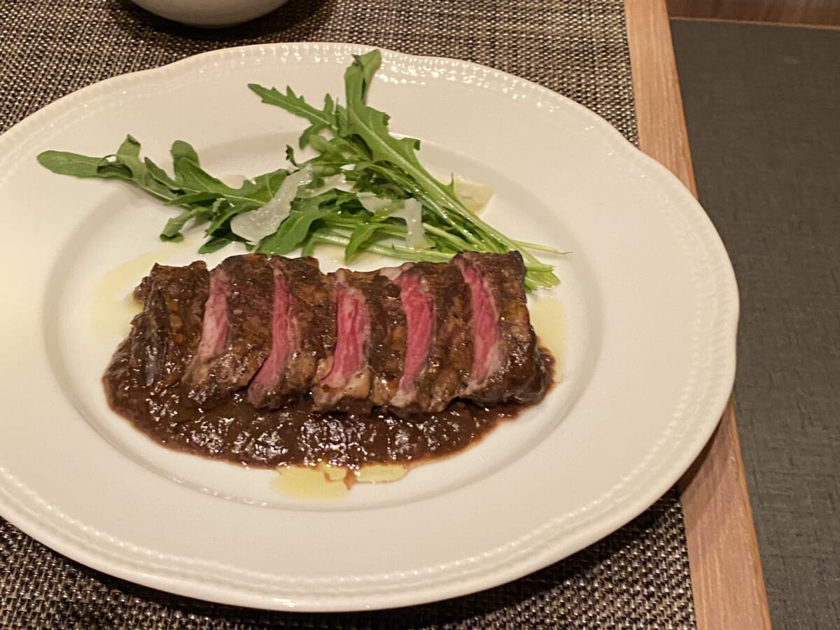 そして、メインディッシュは「牛ハラミ肉のビステッカ」。160gの分厚いハラミ肉を絶妙に焼き上げ、バルサミコとポートワインで仕上げた特製オニオンソースがかかっています。ナイフを入れると、その柔らかさに驚きました。ハラミ肉はジューシーで、適度な歯ごたえがあります。ソースはほのかに甘みがあり肉との相性はもちろんのこと、ご飯にも合う味なので“自宅飯”に最適だと感じました。