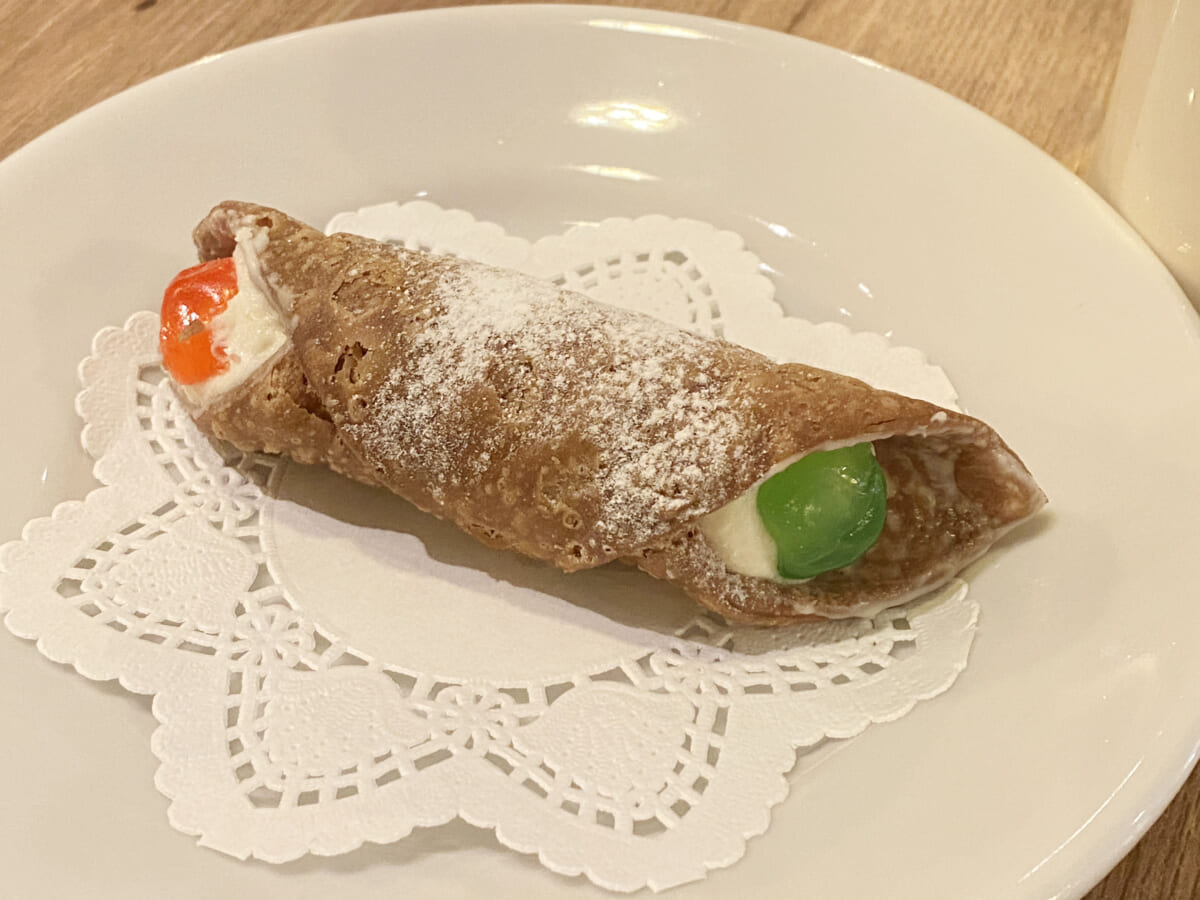 最後は食後のデザート「カンノーリ」。揚げた筒状の生地の中にリコッタやリキュールを漬けたドライフルーツとクリームが入ったシチリアのお菓子です。映画「ゴッドファーザーIII」に出てきたことで有名です 。サクサク食感の中にチーズ風味のクリームが軽い口当たりで、お腹いっぱいでも思わず完食してしまう美味しさでした。