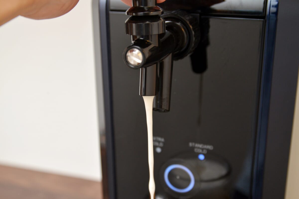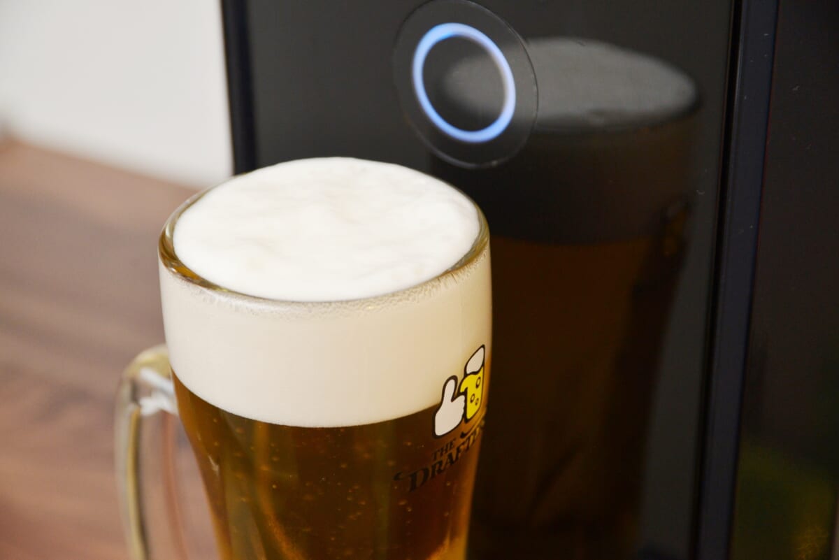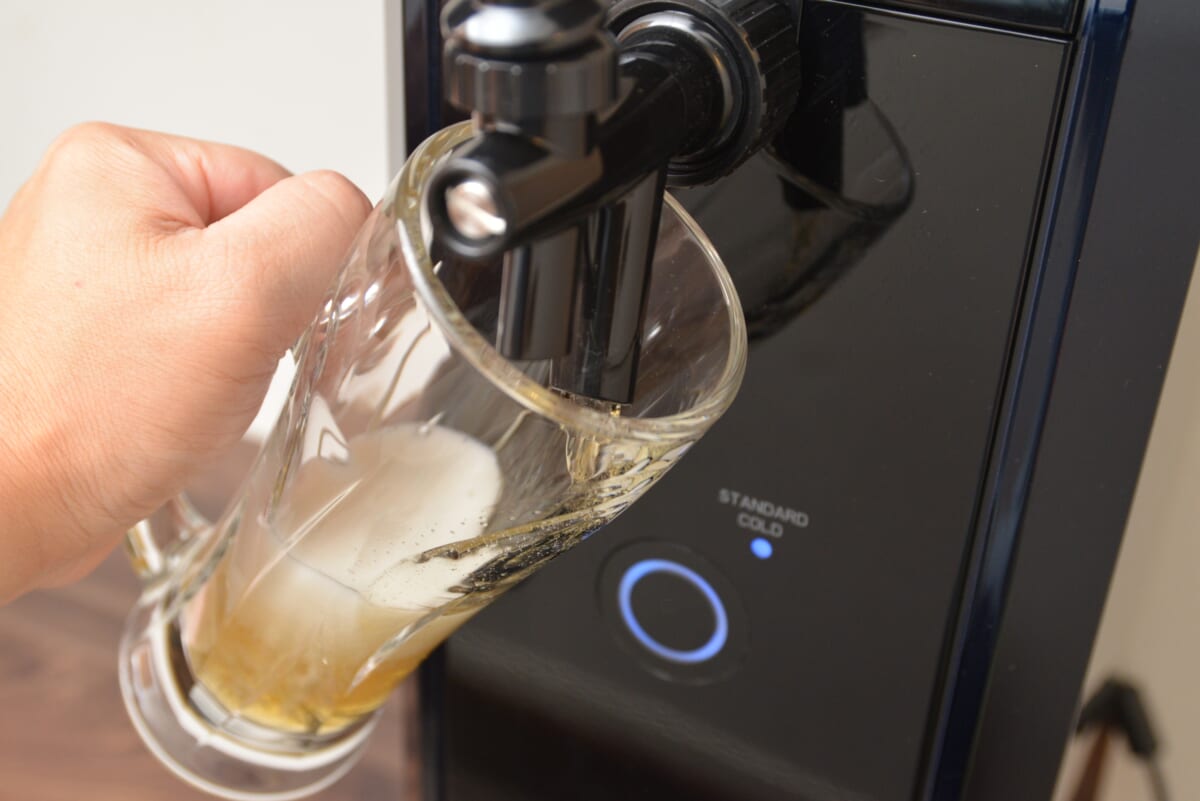 ちなみに、ミニ樽は事前に冷蔵庫で12時間以上冷やしておくとスムーズに飲めます。ぬるいままだとおいしさが低減するうえ、泡だらけになってしまいます。「本格泡リッチサーバー」は本体のスイッチを入れることで冷却機能が働き、常時キンキンに冷えた生ビールが飲めるように。
