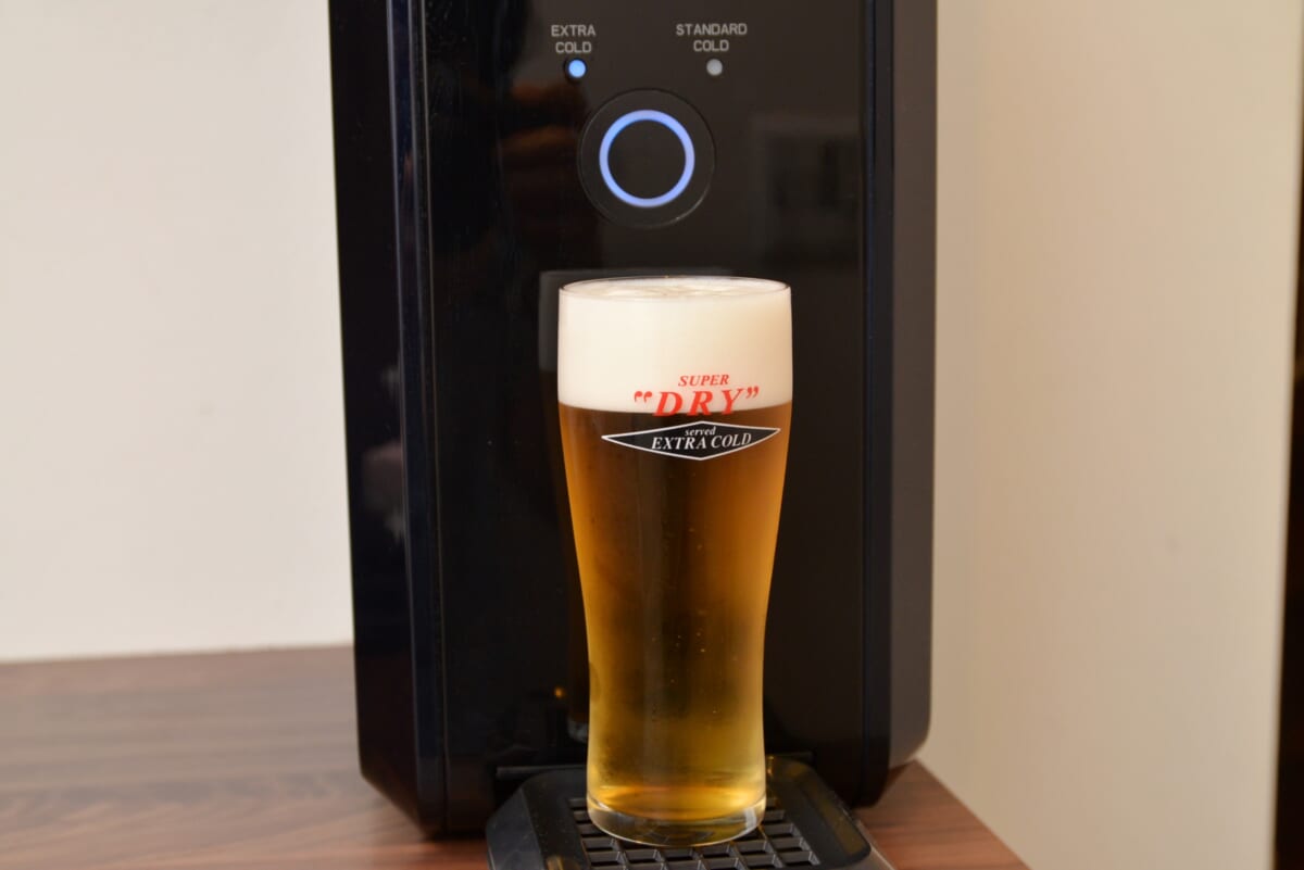 前記の電源ボタンのところでチラッと写りましたが、「本格泡リッチサーバー」は温度帯の違う2つのモードがある点も魅力。一つは「スタンダード・コールドモード」で、一般的なビールの飲みごろである約4℃で抽出します。もう一つは「エクストラコールド・モード」。こちらは“氷点下のスーパードライ”でおなじみの、飲食店などで楽しめる「アサヒスーパードライ エクストラコールド」同様、-2~0℃で抽出するモードです。