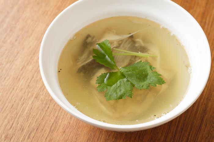 ④③までの出汁は別の料理にも使うベースになるため、この鍋には塩を加えず、潮汁用に使いたい分だけを別鍋に移し、塩加減を整え三つ葉を乗せて完成
