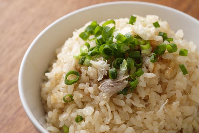 ③炊き上がり後、盛り付ける際にこねぎ、わけぎなどを乗せて完成