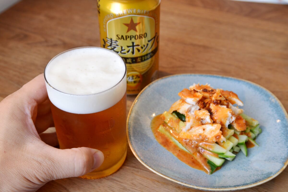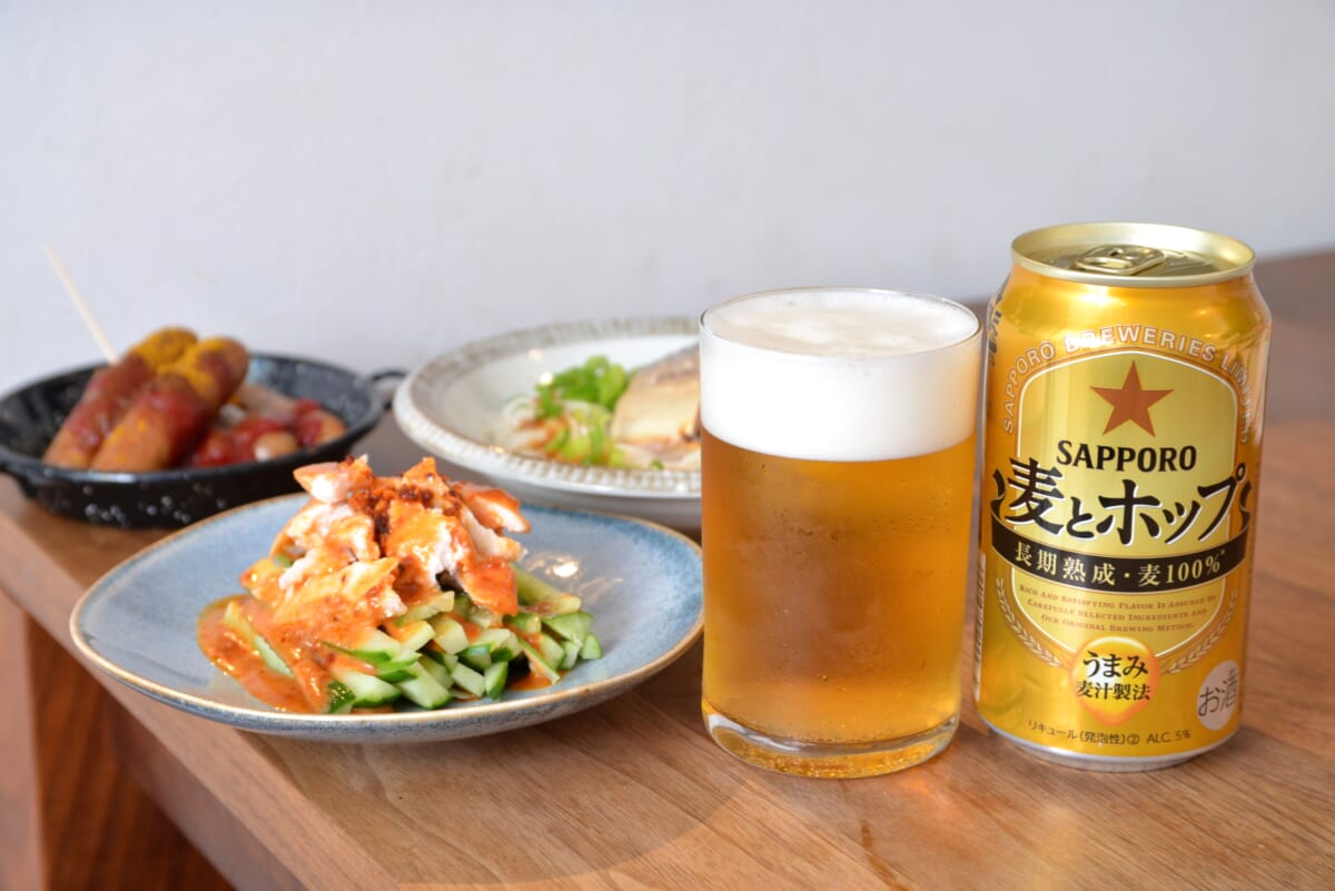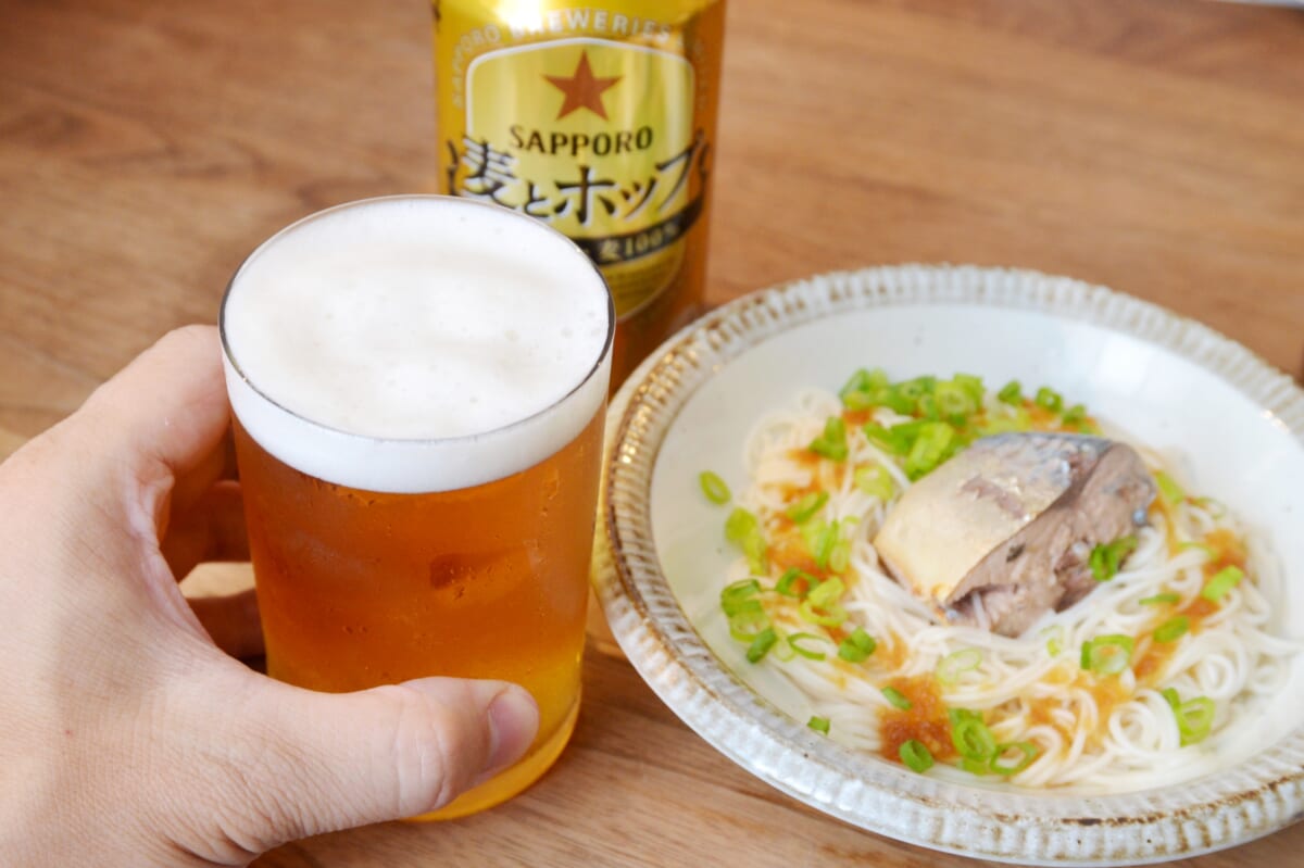 「麦とホップ」の持ち味は麦のうまみですが、この力強い飲みごたえと調和する爽快感も魅力。繊細なテイストの料理と合わせても、素材本来の味を邪魔せずに寄り添ってくれる懐の広さがあり、「#38 鯖缶ポン酢そうめん」ともナイスなフィーリング。