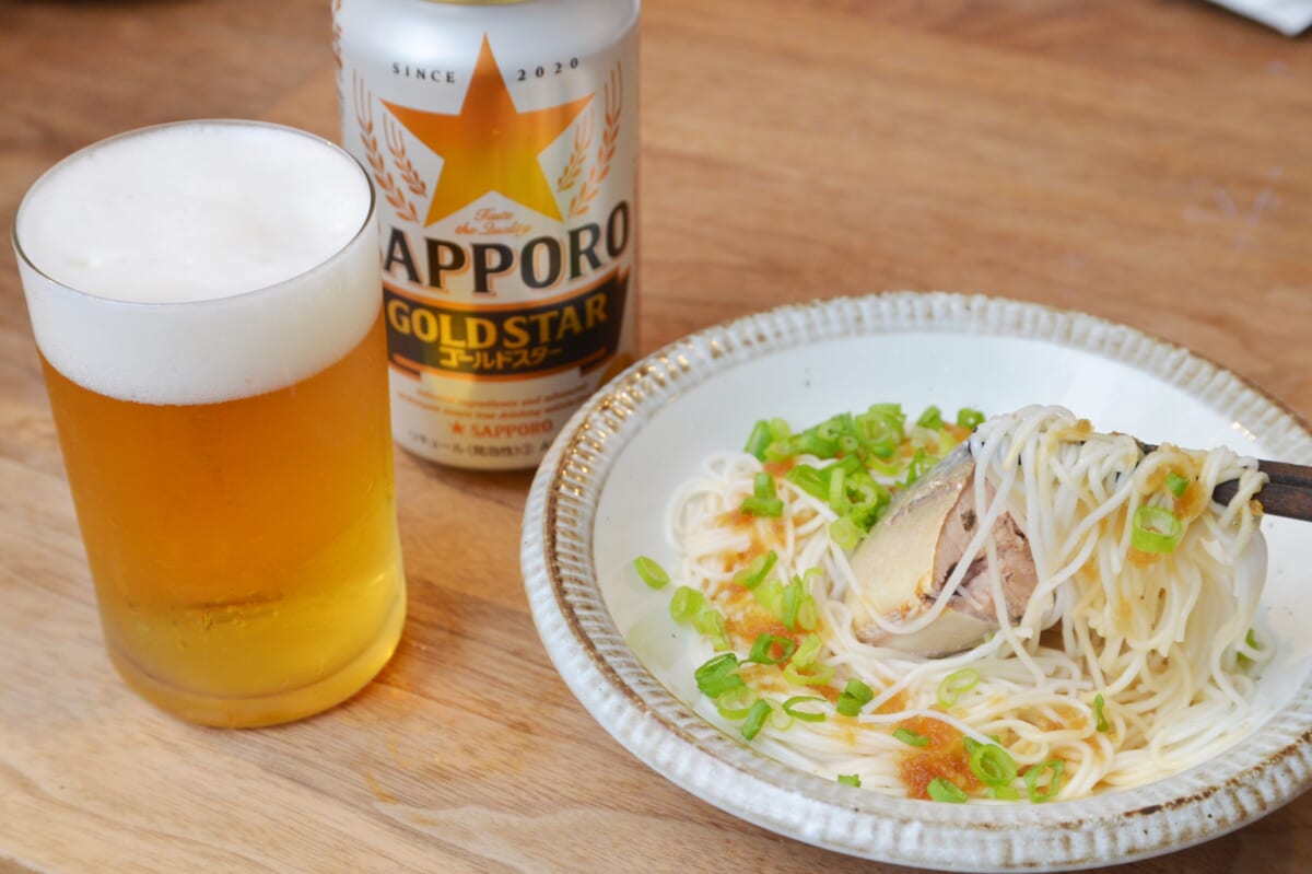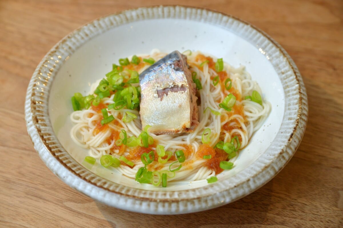 本稿最後の「#推しツマ」は、シメの一品として「#38 鯖缶ポン酢そうめん」を提案。そうめんを茹でて冷やし、水気を切ったら皿に盛り、さば缶、ポン酢、ネギを加えて完成です。麺が細く茹で時間が短くて済むのも、そうめんつまみのナイスなところ。