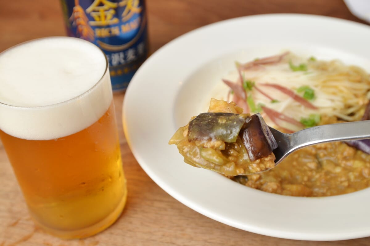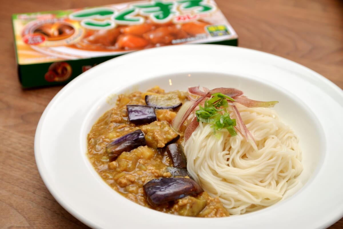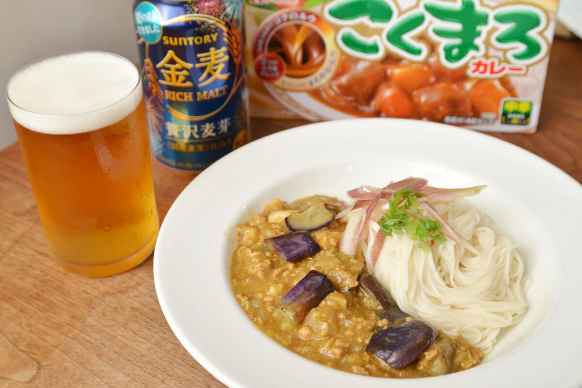 今回作った「和香るキーマカレー2021」は白米のほか、冷たいそうめんにかけてもおいしいとのことで、ますます夏らしいそうめんで盛り付け。つまみにするにも、飲みのラストにツルッとシメるにももってこいです。