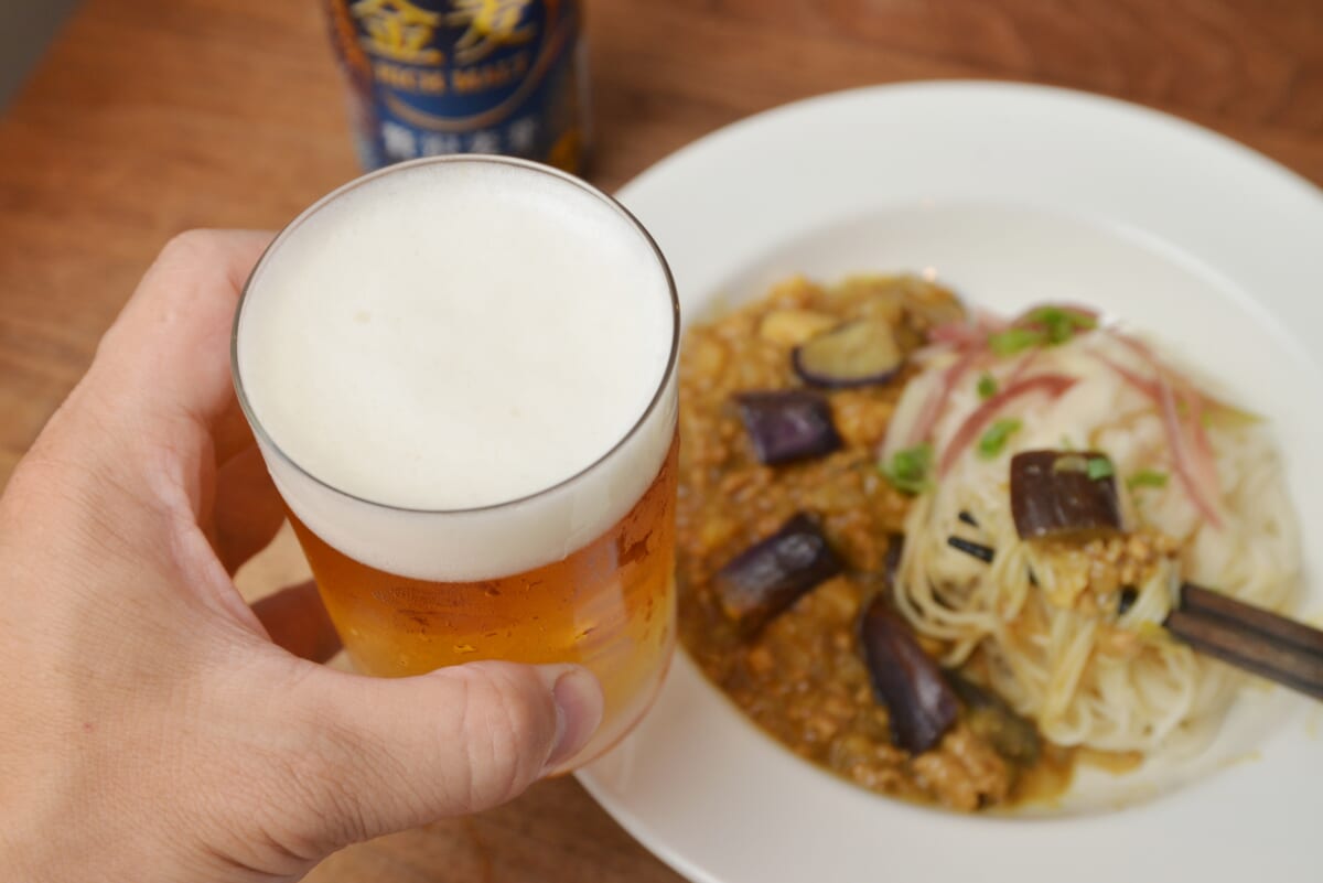 いざ完成。さっそく「金麦」と合わせてみると、麦のうまみとホップの香りや苦味、シャープなキレなどがバランスよく調和し、確かに爽快感も心地いいです。