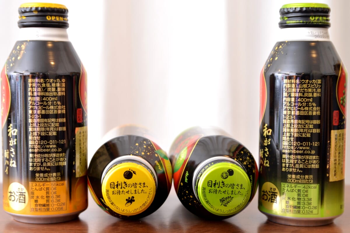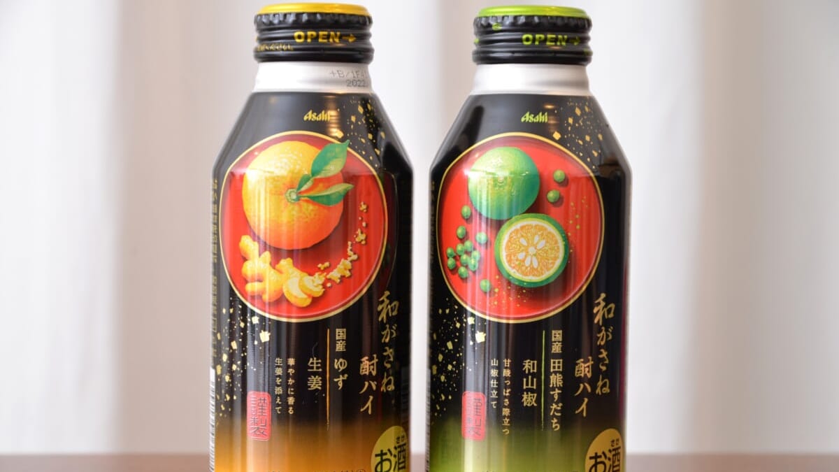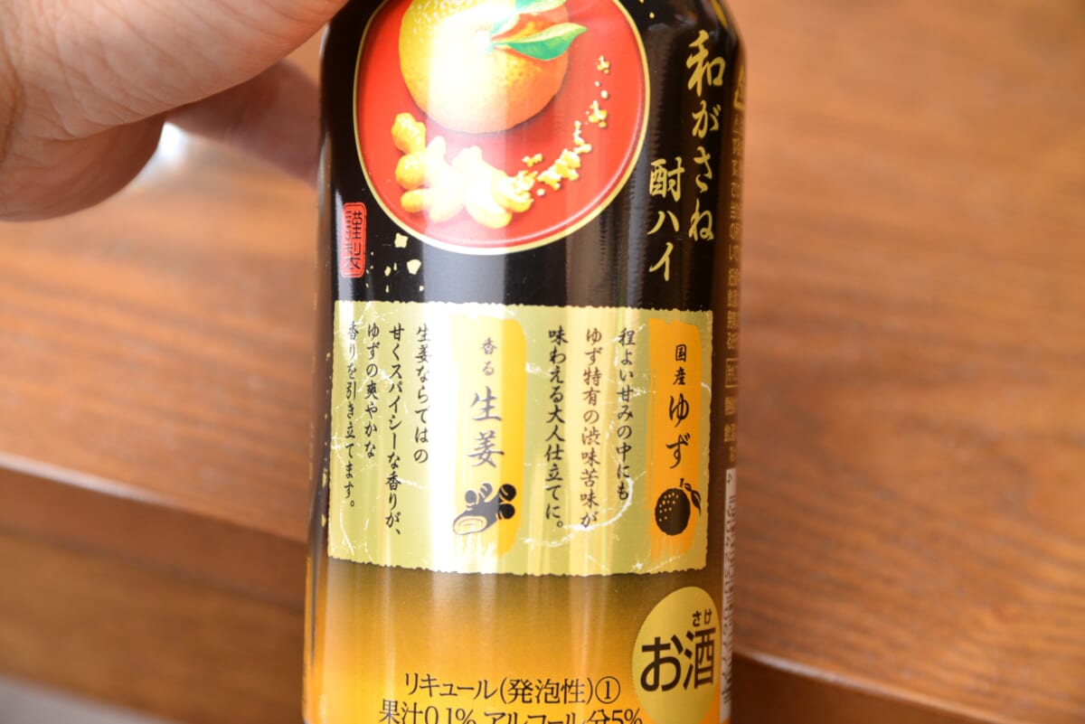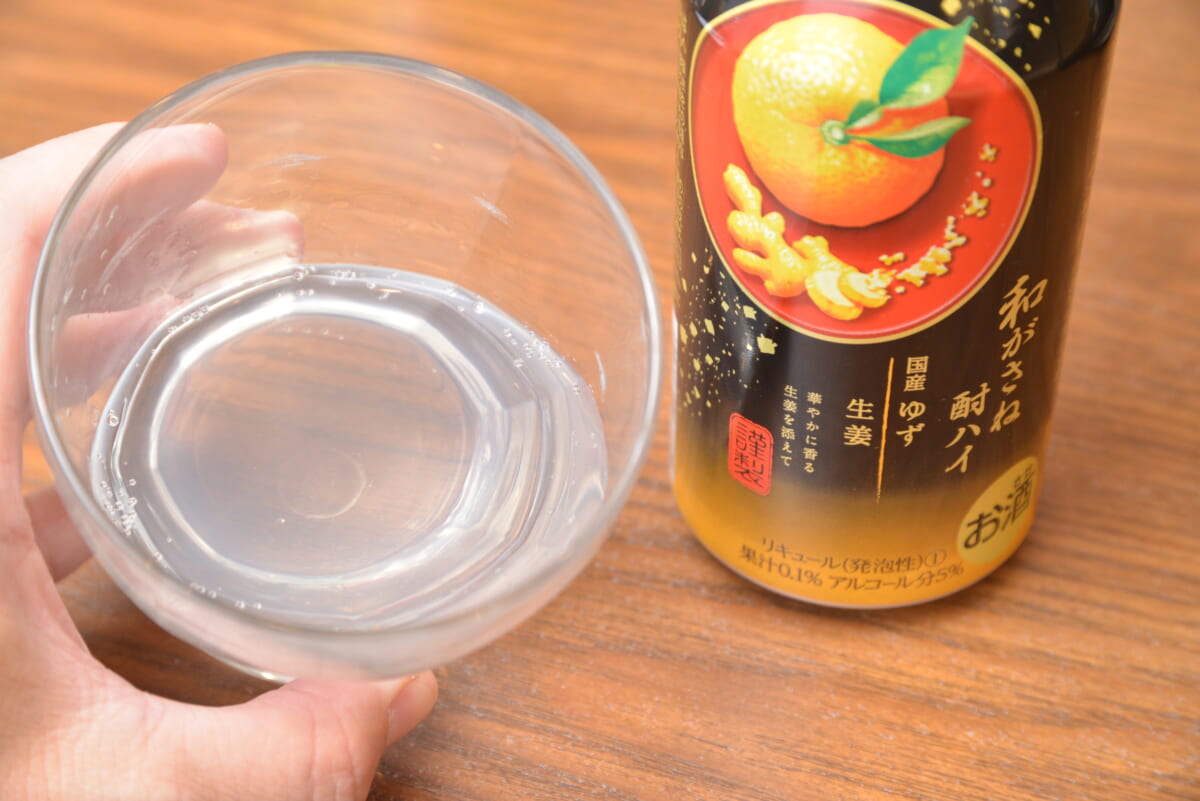 本稿では色味を伝えるため、グラスに注いで撮影していますが、グラスに注がなくても豊かな香りを最大限に享受できるのは、広口ボトルならではでしょう。ということで、まずは「アサヒ 和がさね酎ハイ国産ゆず生姜」からひと口。