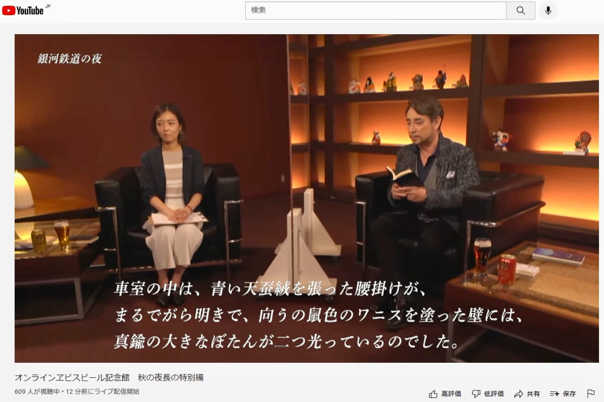 選ばれた作品は、ヱビスビール好きのファンに行った事前アンケートで、特に「読んでみたい」という声が多かった「星の王子さま」「舟を編む」「銀河鉄道の夜」。サッポロビール マーケティング本部の沖井尊子さんと会話しながら、読書とともにヱビスビールを楽しむという贅沢な時間を提案してくれました。