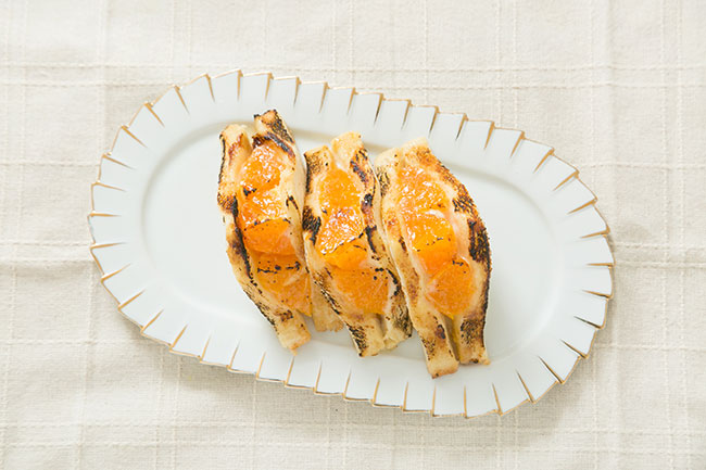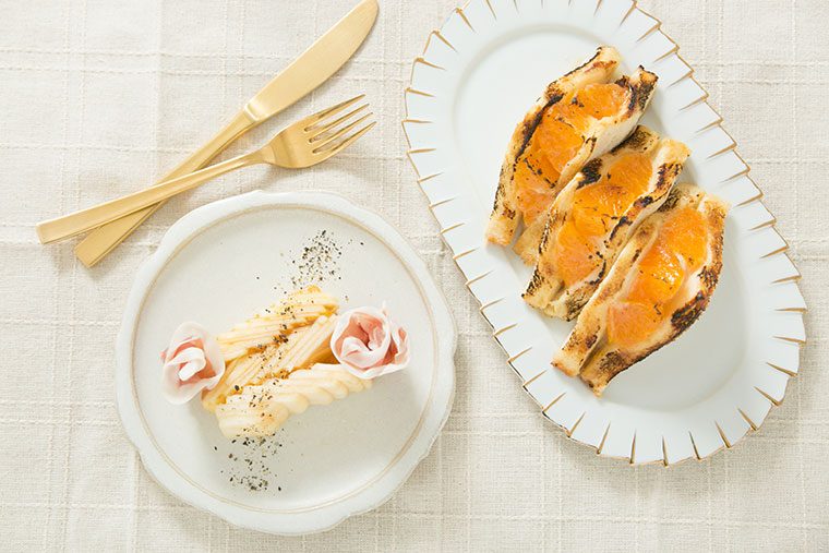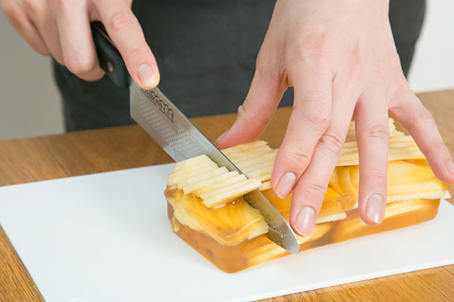 斜めに立てかけたりんごが美しく仕上がりました。生ハムのしょっぱさで、テリーヌの甘さが一層引き立ちます。「パウンド型からテリーヌを取り外すとき、もしもうまく剥がれそうにない場合は、底の部分だけちょっと温かいお湯に5秒ほど浸けてみてください。横にはナイフを入れると、スムーズに取り外すことができますよ」