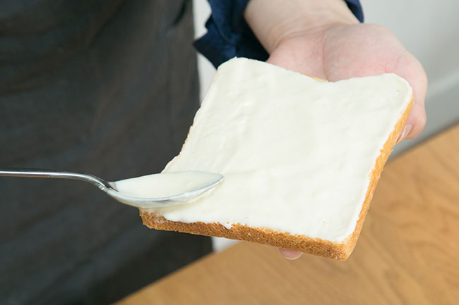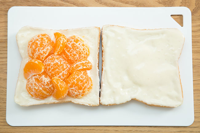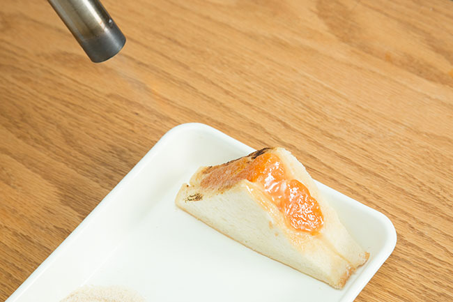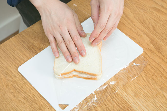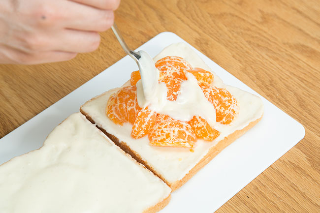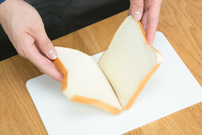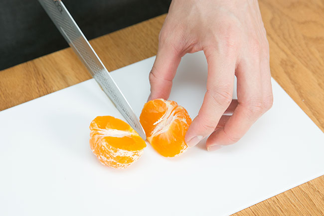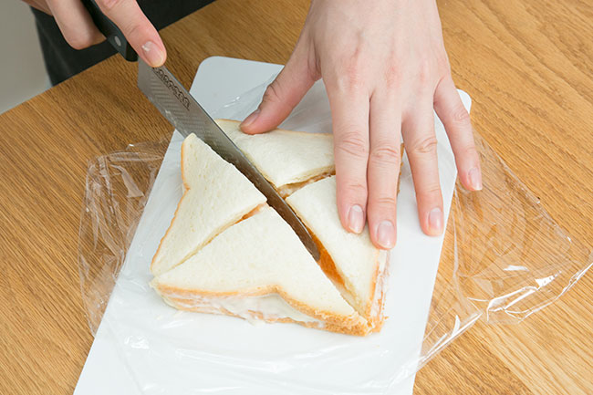 ゼリーがしっかり固まったのが確認できたら、包丁でカットしましょう。「このときもフルーツサンドと同様に、あまり包丁を動かしすぎず、長い刃を利用して奥に押しながら一気に切ります」