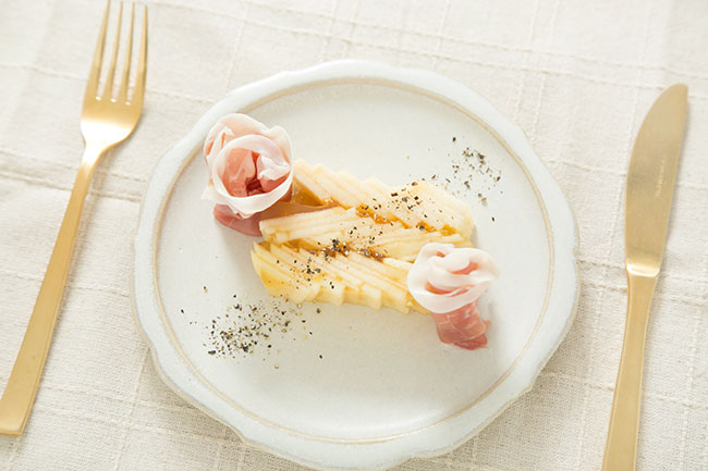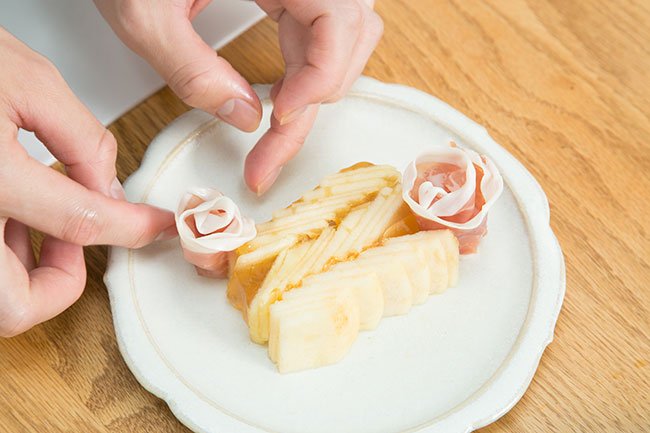 生ハムはくるくると巻いて添えると、お花の形みたいでよりかわいらしく盛り付けることができます。