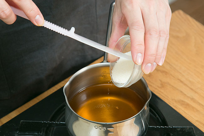 アイスティーをしっかり温めたら、粉ゼラチンを溶かしていきます。「ふつふつする程度になったら、粉ゼラチンを入れて、ダマにならないようによく混ぜます。よく溶けたら、カルダモンパウダーを入れましょう」