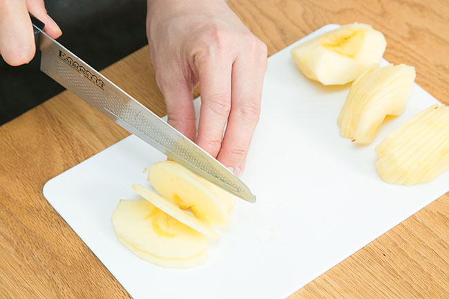 りんごは、皮を剥いて4等分にし、芯を取ったら2mm幅くらいの薄さに切ります。「後々並べやすいように、切ったらバラバラにせず、そのままの状態にして置いておきましょう」