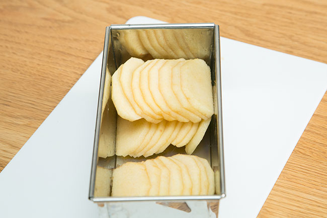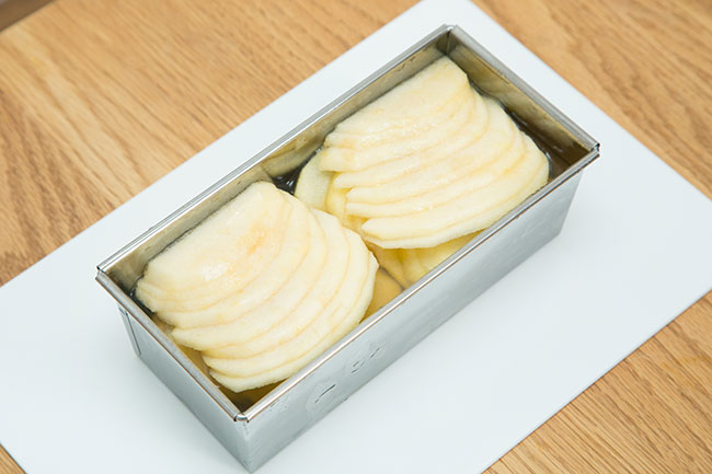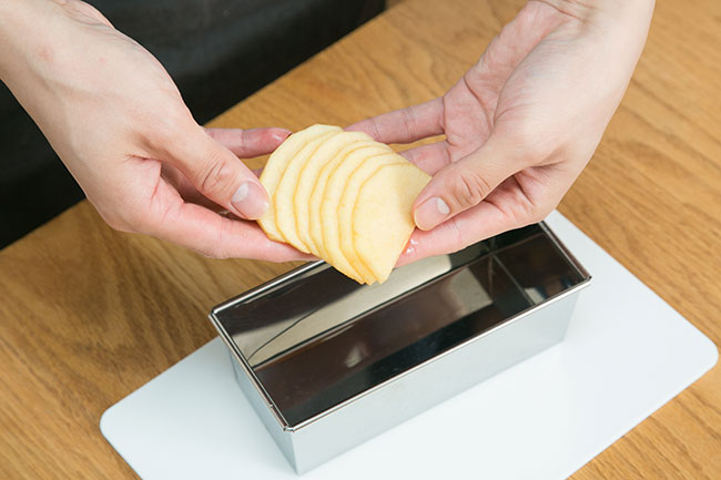 並べ方のコツは、なるべく型に立てかけるようにして空洞を作ること。互い違いになるように2層目を置いていきます。「その空洞の部分にゼリーを流し込むので、あまりびっちりとさせないことが大切です。底の部分やりんごを積み重ねるあたりにもゼリーを流し入れたいので、斜めに入れていきます」