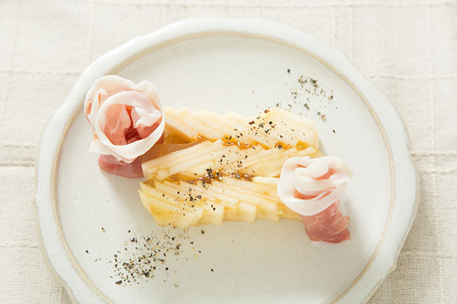 「カルダモンはスイーツにも肉料理にも使うスパイス。フルーツと、添えた生ハム両方に合うので、ぐっと品のよい味に仕上がります」