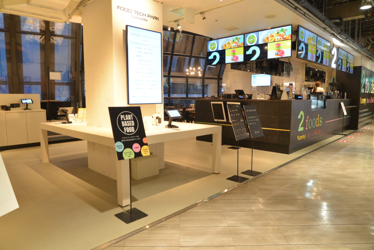 同社が4月の開業時に併設オープンした「フードテックパーク」もその理由です。ここは、2020年の日本出店以降注目度が増す「b8ta」のフードテック専門版ともいえる店舗で、日本未発売のプラントベースドフードを展示している点が他にない魅力。