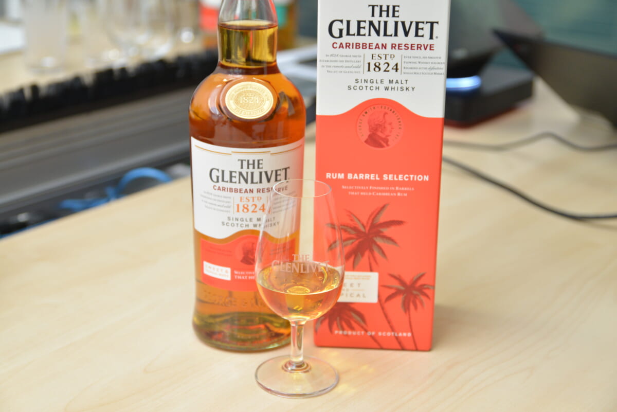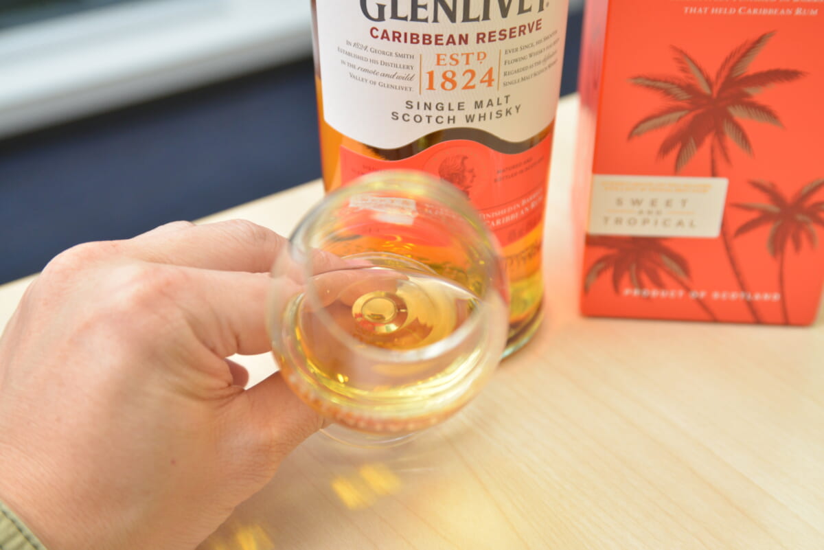 カリビアンラムの熟成樽を使用するフィニッシュは、「ザ・グレンリベット」初の試みだとか。まずはストレートで味わってみると、確かにトロピカルなニュアンスが印象的に感じられます。