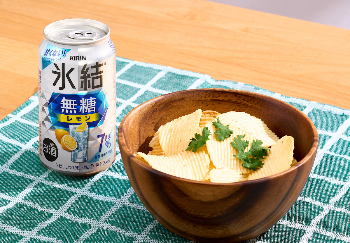 軽くつまみたいときに重宝する乾きもの。スナック、せんべい、ナッツ、いかの燻製など様々ですが、特にオススメなのがポテトチップスです。なかでも、サワークリームオニオンのような、洋風の濃厚なタイプが「氷結(R)無糖 レモン」にベストマッチ。サワークリームの酸味が「氷結(R)無糖 レモン」の酸味と調和し、揚げ油のオイルは炭酸の刺激がすっきりリセット。ひと口食べた直後に次の食指がつい伸びてしまう、ニクい組み合わせです。