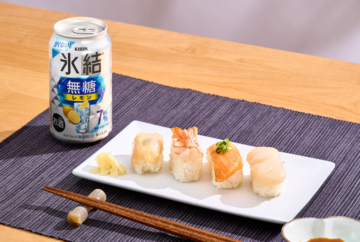 「氷結(R)無糖 レモン」は、刺身や寿司のような繊細な料理にも合います。貝類や海老なら素材のうまみや食感を生かしつつ、サーモンのような濃厚な寿司だねは油分を中和させつつマッチ。この相性のよさは、クリアな「氷結(R)」ブランドならではだと思います。