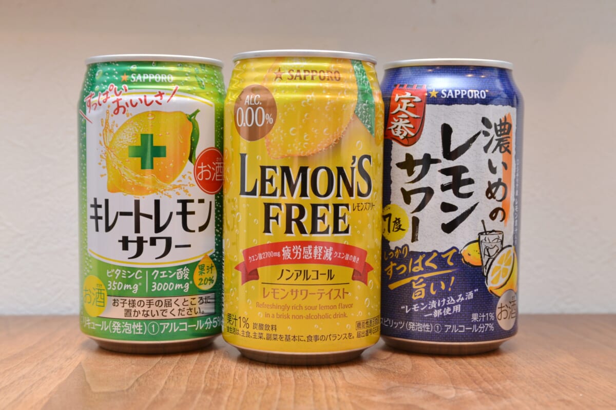 3種を飲み比べて感じたのは、どれもレモン感が抜群で味も濃く、氷をたっぷり入れてもまったくパワーダウンしないということ。休肝日には「サッポロ LEMON‘S FREE」、普通にお酒を楽しむなら「キレートレモンサワー」、より濃厚な味やボディを求めるなら「サッポロ 濃いめのレモンサワー」といった選択肢でチョイスするといいと思います。