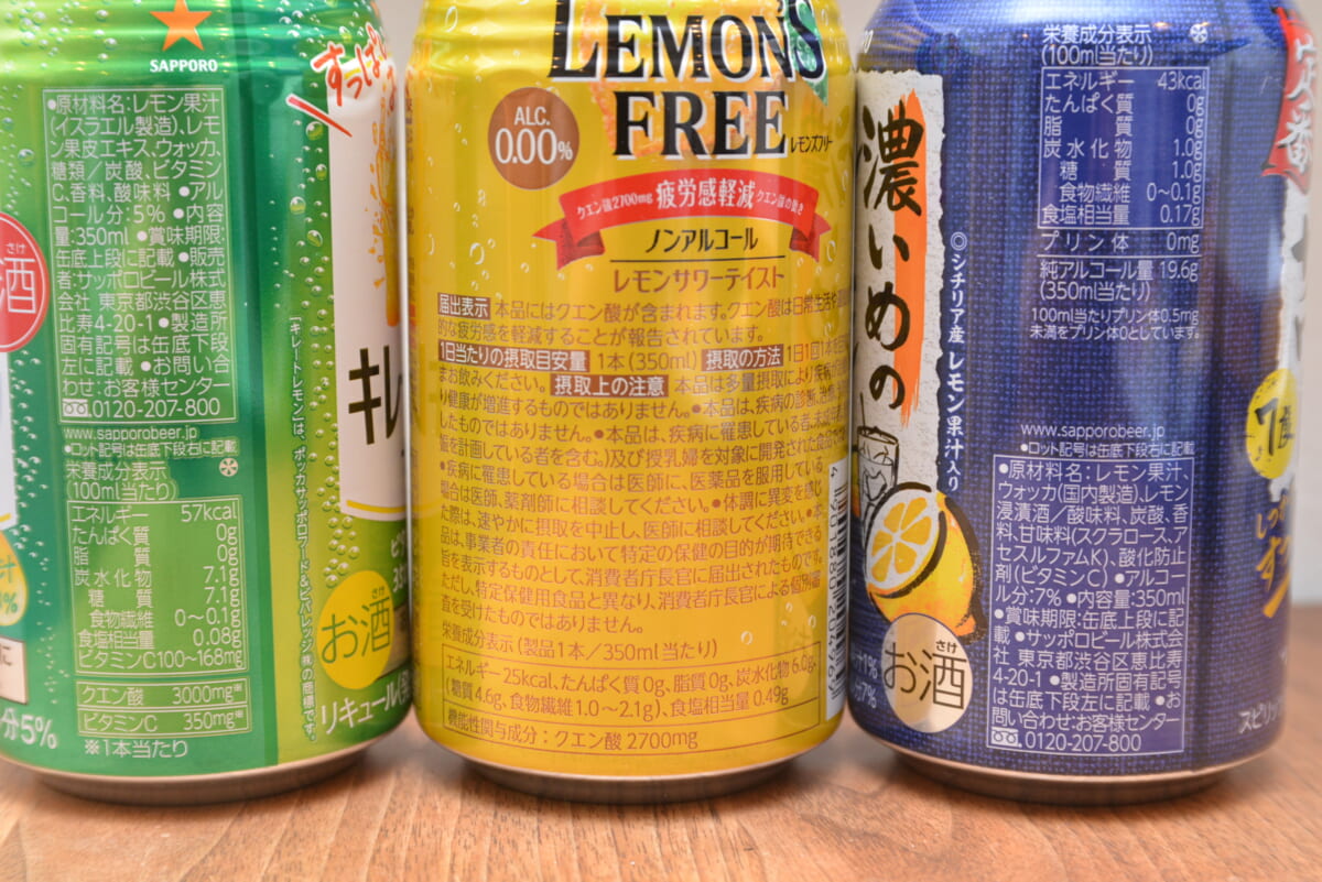 イベントの利きレモンサワーで用意されたのは、「サッポロ LEMON‘S FREE」のほか「キレートレモンサワー」と「サッポロ 濃いめのレモンサワー」。それぞれアルコール度数も違いますが、まずはスペックから比較。
