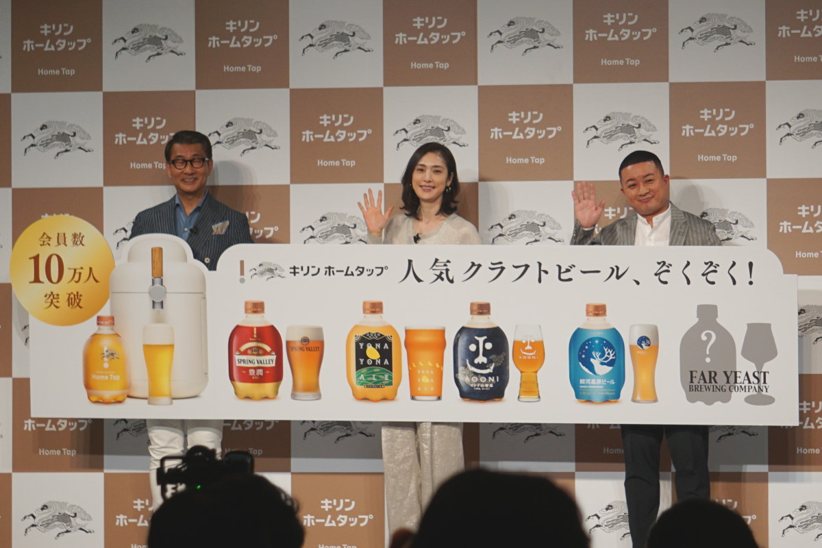 また、発表会にはキリン ホームタップのCMに出演している俳優の中井貴一さんと天海祐希さん、さらに最近ホームタップを利用し始めたというチョコレートプラネットの松尾駿さんが登場。それぞれ、どのようなシーンでホームタップのビールを楽しんでいるのか、またホームタップをオススメしたい人は誰か、などトークセッションを披露しました。