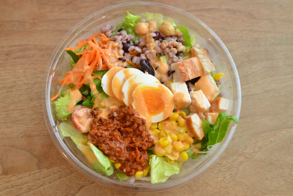 ケールとベーコンのほかにはレタス、ブロッコリー、大根、砕いたゆで卵などが入っています。大根は一見違和感を覚えましたが、食べれば納得。シャキッとしたみずみずしさのアクセントになっていて、濃厚なシーザードレッシングとも好相性です。ベーコンは小さいながらもジューシーで存在感が大きく、ケールは「スパイシー・ケール・バイマイ」ほどインパクトはないものの、あまり食べ慣れていない層向けにはちょうどいい量だと思いました。