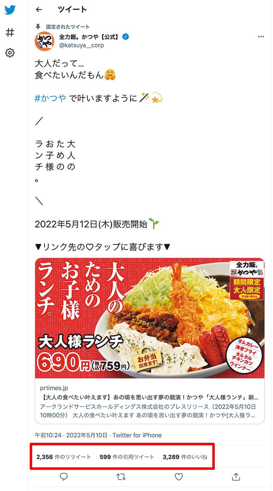 意外性のある内容としずる感たっぷりのビジュアルで、かつや公式Twitterの予告投稿がリツイート数2000件以上の大反響。売り上げは想定の3倍以上で、ここ数年の期間限定メニューではトップの売れ行きだった。
