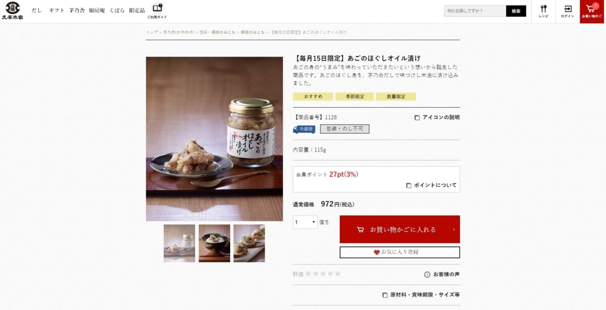「あごのほぐしオイル漬け」は2022年6月15日にデビューし、毎月15日限定発売というレア商品。これは、10月15日が「九州あご文化の日」であり、久原本家では毎月15日を「茅乃舎のあごの日」としているから。購入機会はひと月に1回のみ、年に12日ぶんしかチャンスがないという希少性が、購買意欲をかきたてます。